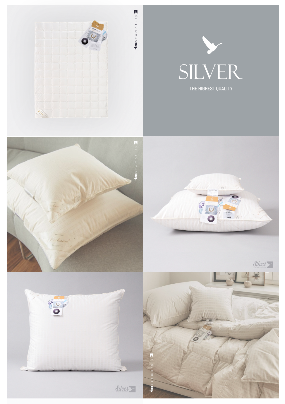 SILVER – ekskluzywna tkanina bawełniana o szlachetnym połysku z wplecioną nicią srebra, w połączeniu z najdelikatniejszym polskim puchem gęsim 90% tworzą zdrowe, wolne od roztoczy środowisko snu.