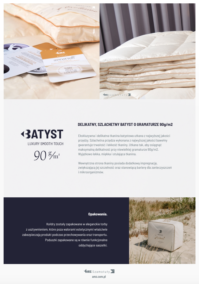 • Tkanina pokryciowa: delikatny, szlachetny batyst - 100% bawełna o gramaturze 90g/m2