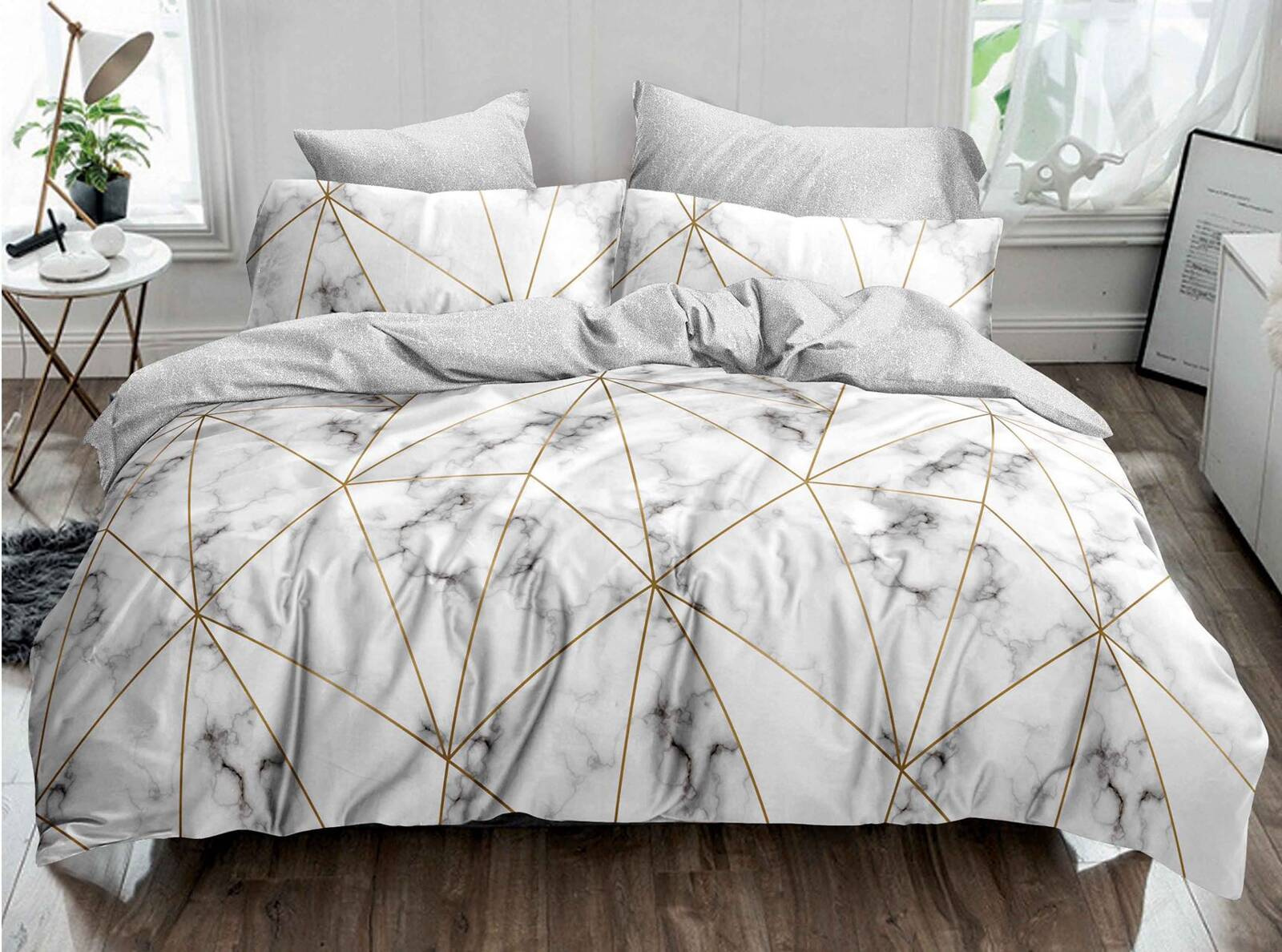 • Komplet pościeli 160x200 skład: 100% mikrowłókno dwustronna poszewka na kołdrę i 2 x poszewka na poduszkę 70x80, prześcieradło 180x230, pościel marmurkowa, biała, jasna szara, złota