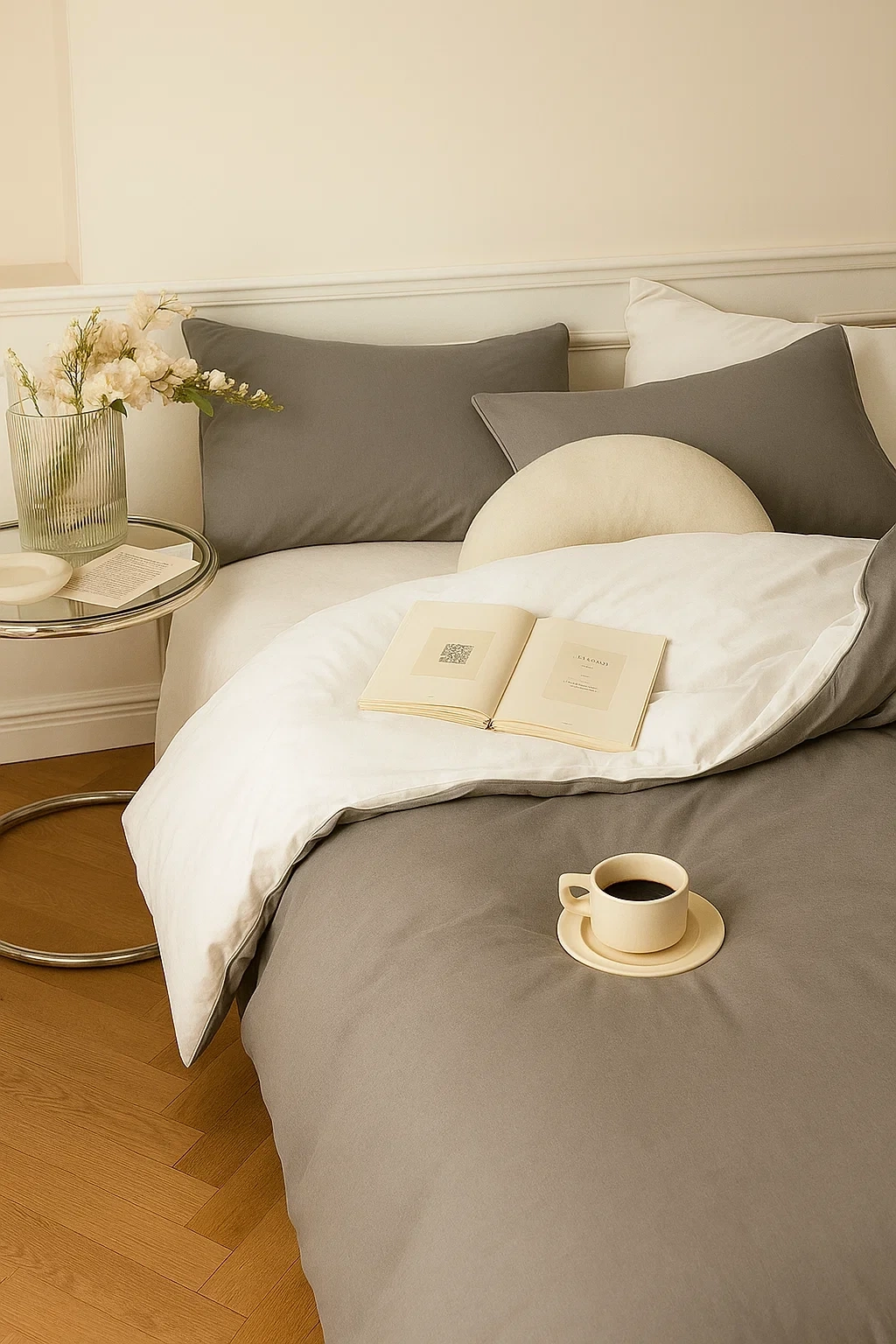 - Komplet naturalnej pościeli bawełnianej 140x200 skład: 100% bawełna dwustronna, poszewka na kołdrę i 1 x poszewka na poduszkę 70x80 gładka szara, biała