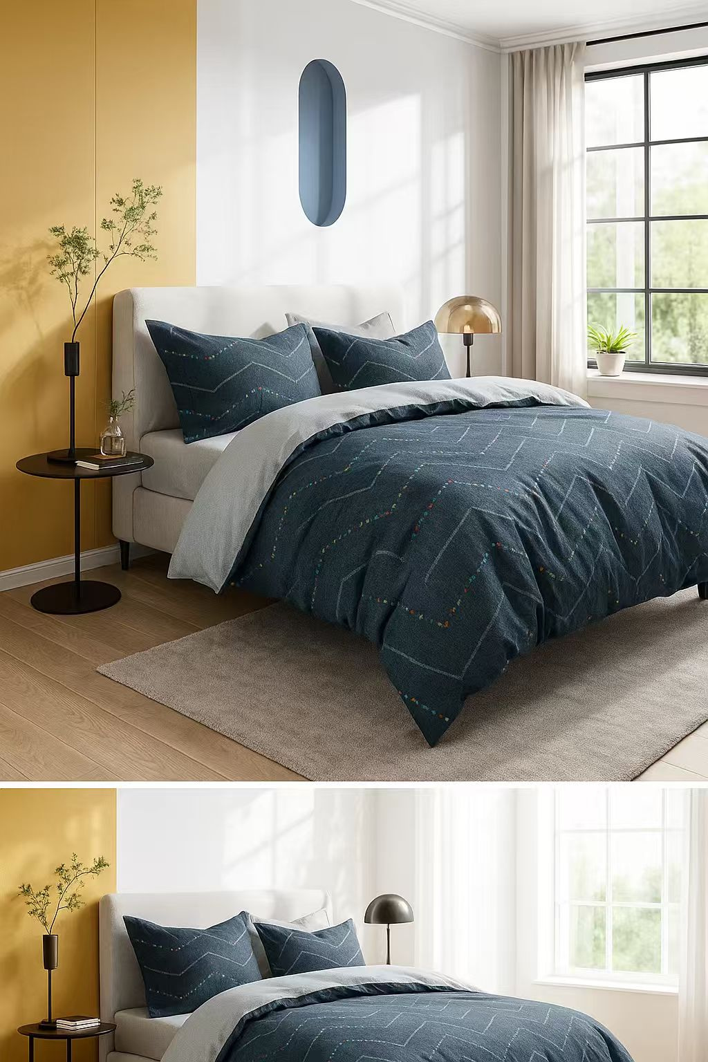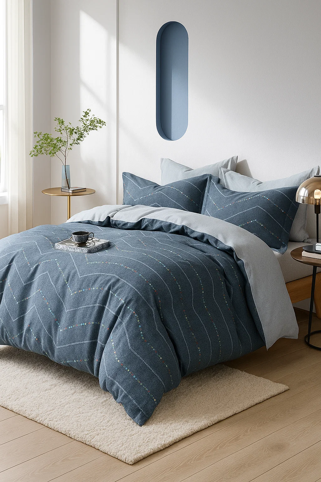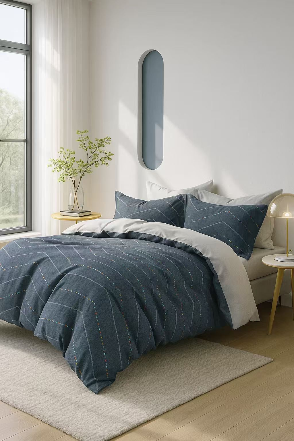 • Komplet naturalnej pościeli bawełnianej 140x200 skład: 100% bawełna dwustronna, poszewka na kołdrę i 1 x poszewka na poduszkę 70x80 pościel w geometryczna, ciemna szara, niebieska