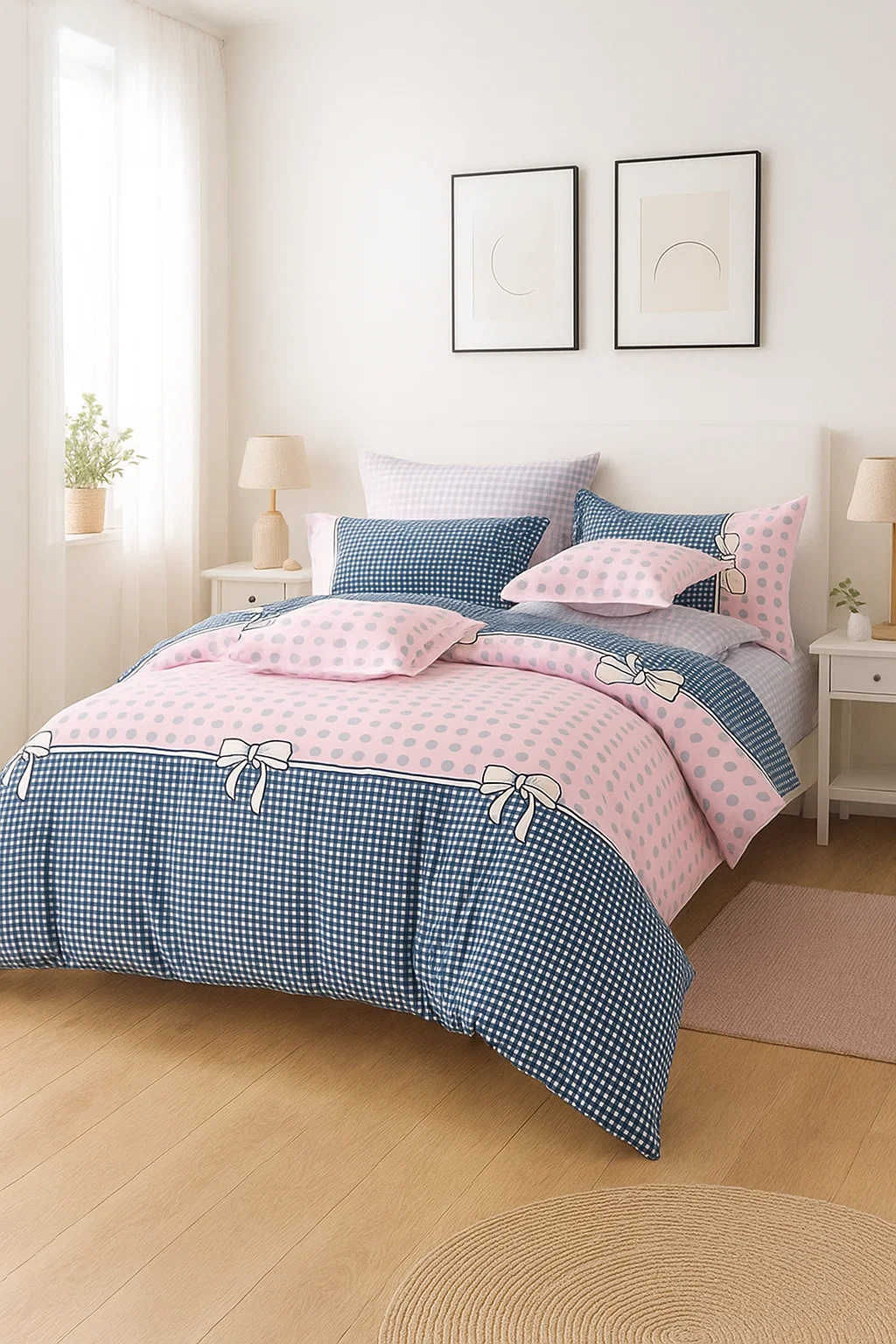 - Komplet pościeli bawełnianej 140x200 skład: 100% bawełna dwustronna poszewka na kołdrę i 1 x poszewka na poduszkę 70x80 naturalna, różowa, niebieska, w kokardy, w kokardki, wstążki