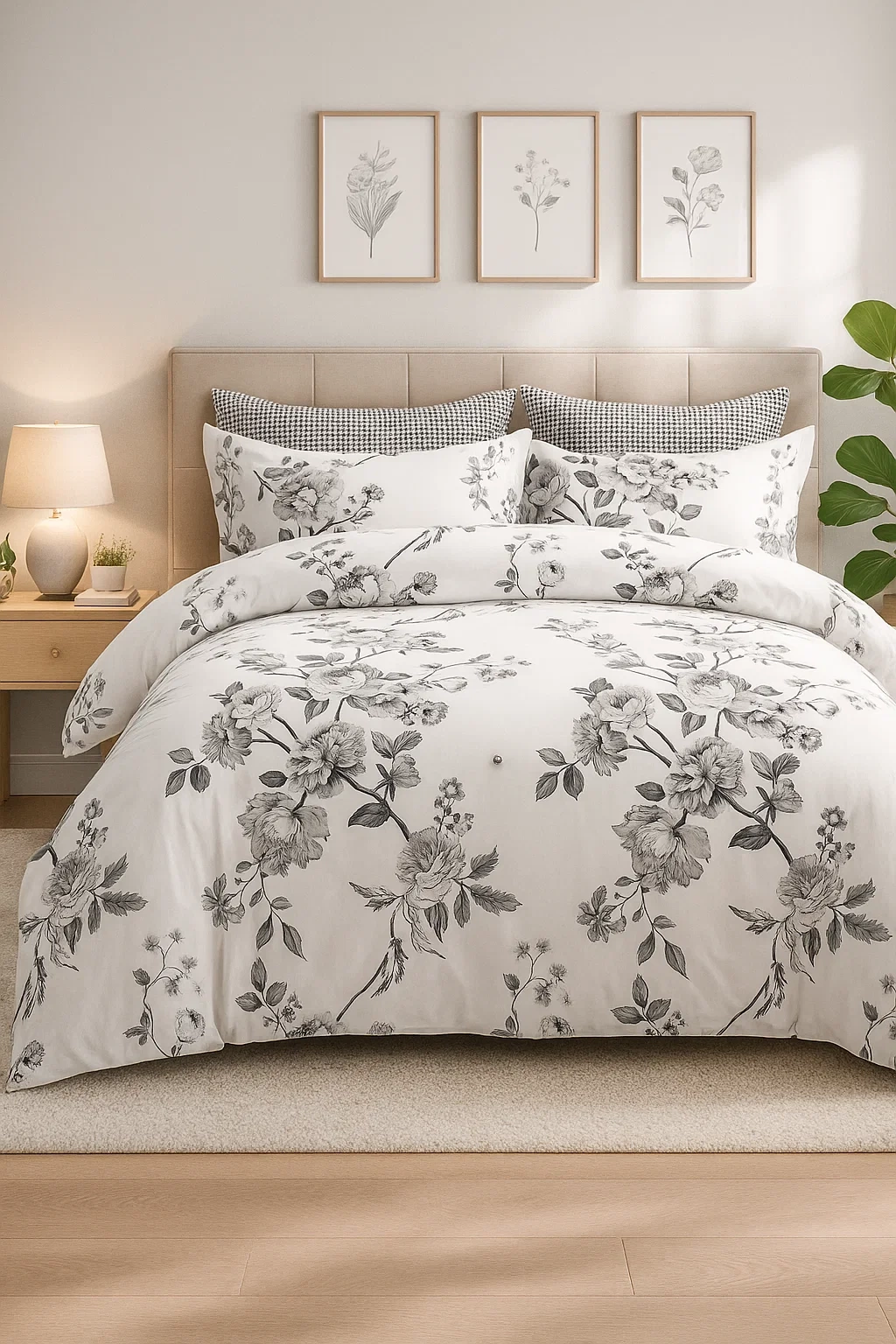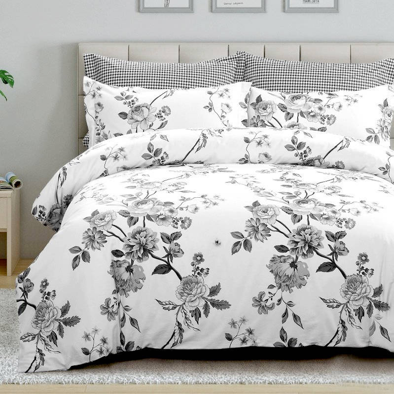 - Komplet pościeli bawełnianej w kwiaty 160x200 skład: 100% bawełna dwustronna, biała w czarne kwiaty, poszewka na kołdrę i 2 x poszewka na poduszkę 70x80