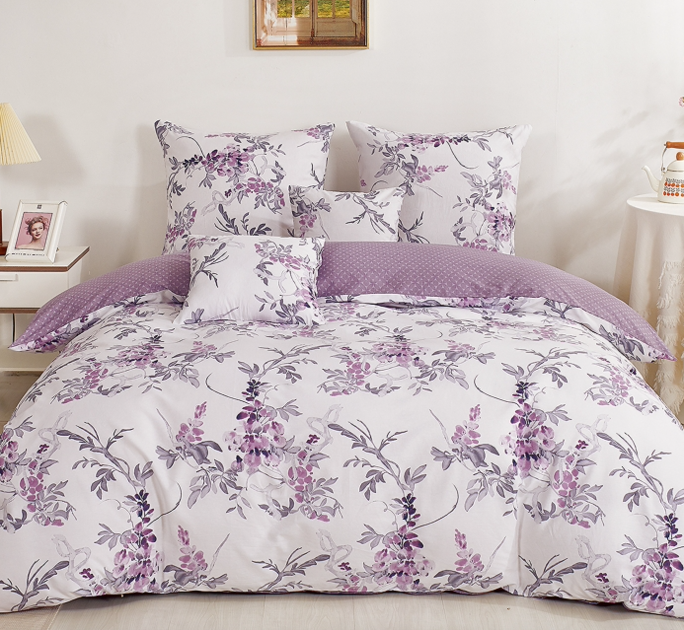 - Komplet naturalnej pościeli bawełnianej 160x200 skład: 100% bawełna dwustronna, poszewka na kołdrę i 2 x poszewka na poduszkę 70x80 fioletowa w kwiaty