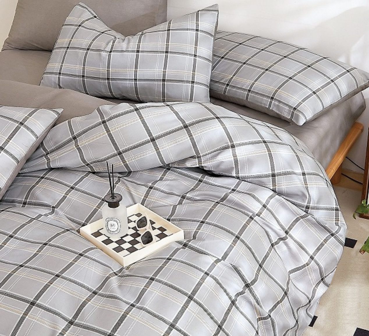 - Komplet naturalnej pościeli bawełnianej 160x200 skład: 100% bawełna dwustronna, poszewka na kołdrę i 2 x poszewka na poduszkę 70x80 pościel w kratę, jasna szara