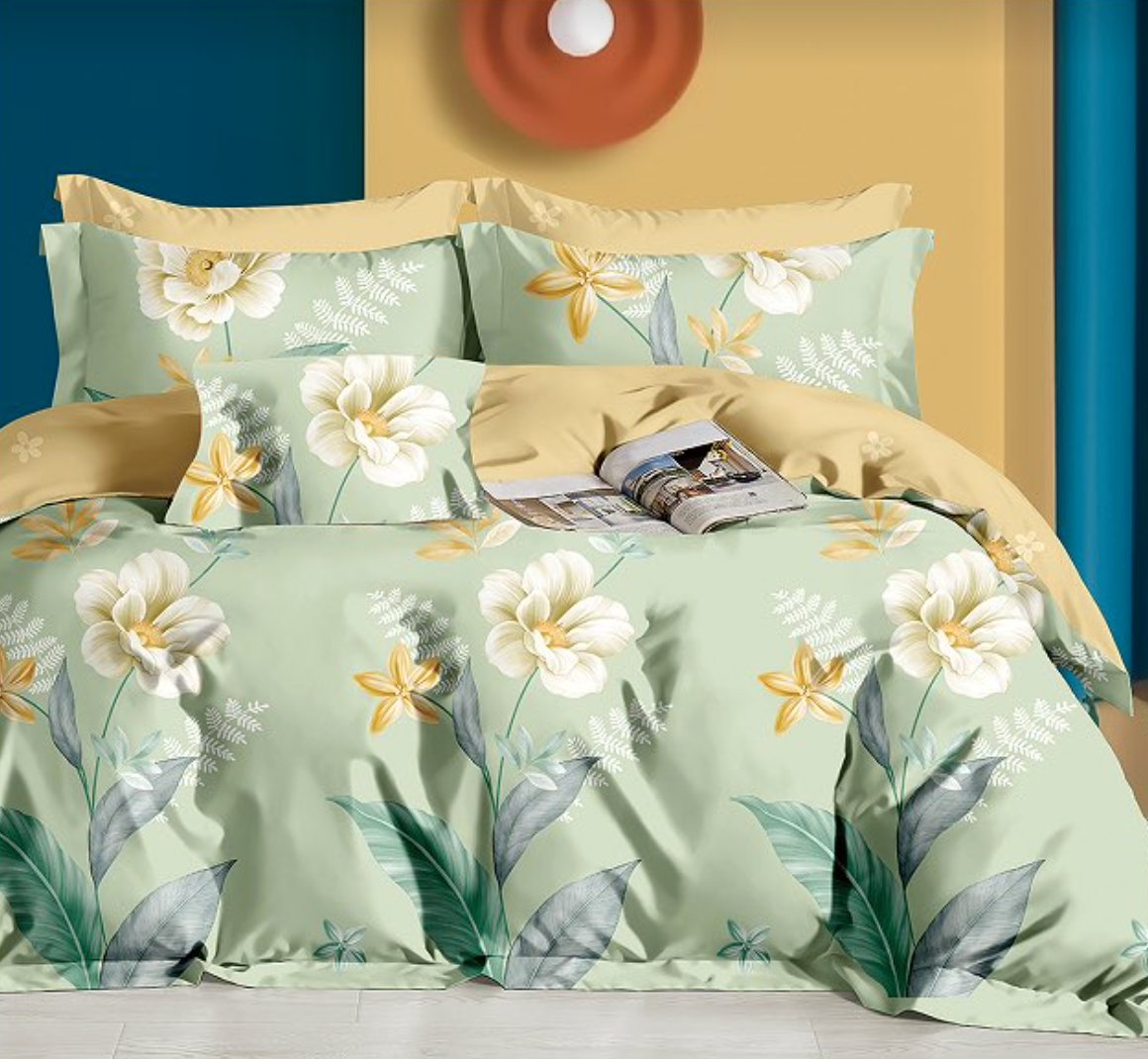 - Komplet naturalnej pościeli bawełnianej 160x200 skład: 100% bawełna dwustronna, poszewka na kołdrę i 2 x poszewka na poduszkę 70x80 zielona, żółta w kwiaty, żonkile
