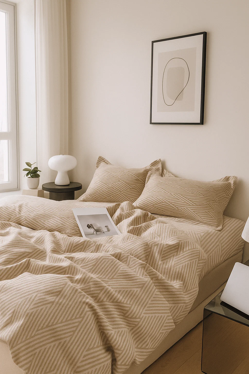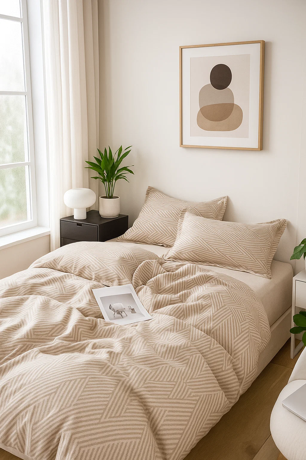 • Komplet pościeli beżowej w geometryczny wzór to stylowy dodatek do każdej sypialni. Dzięki tej pościeli, sen staje się jeszcze bardziej przyjemny, a sypialnia nabiera wyjątkowego charakteru.