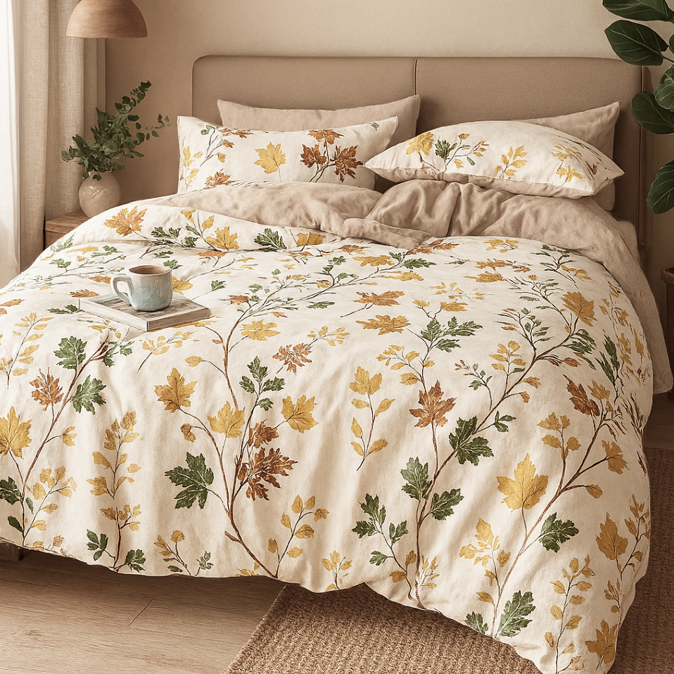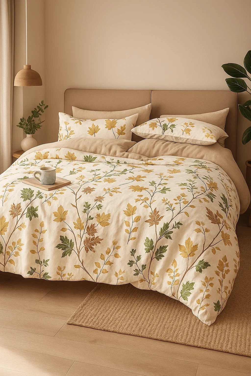 - Komplet pościeli bawełnianej 160x200 skład: 100% bawełna dwustronna, poszewka na kołdrę i 2 x poszewka na poduszkę 70x80, kremowa, beżowa w liście
