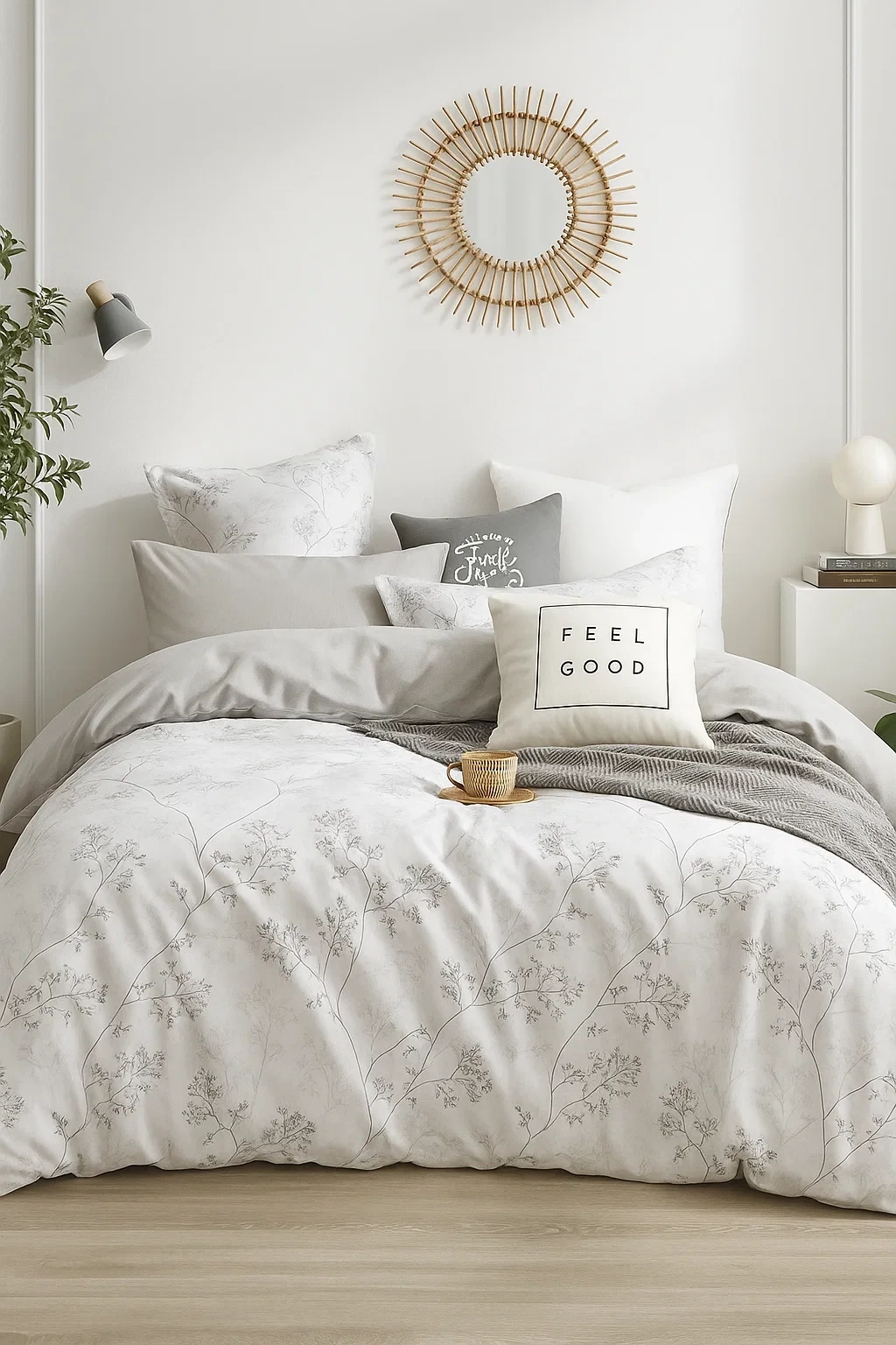 - Pościel jasna szara z delikatnymi z kwiatami to elegancki wybór do każdej sypialni. Szarość nadaje jej nowoczesny charakter, podczas gdy subtelne gałązki dodają uroku. Dzięki neutralnej kolorystyce, pasuje do różnych stylów wnętrz.