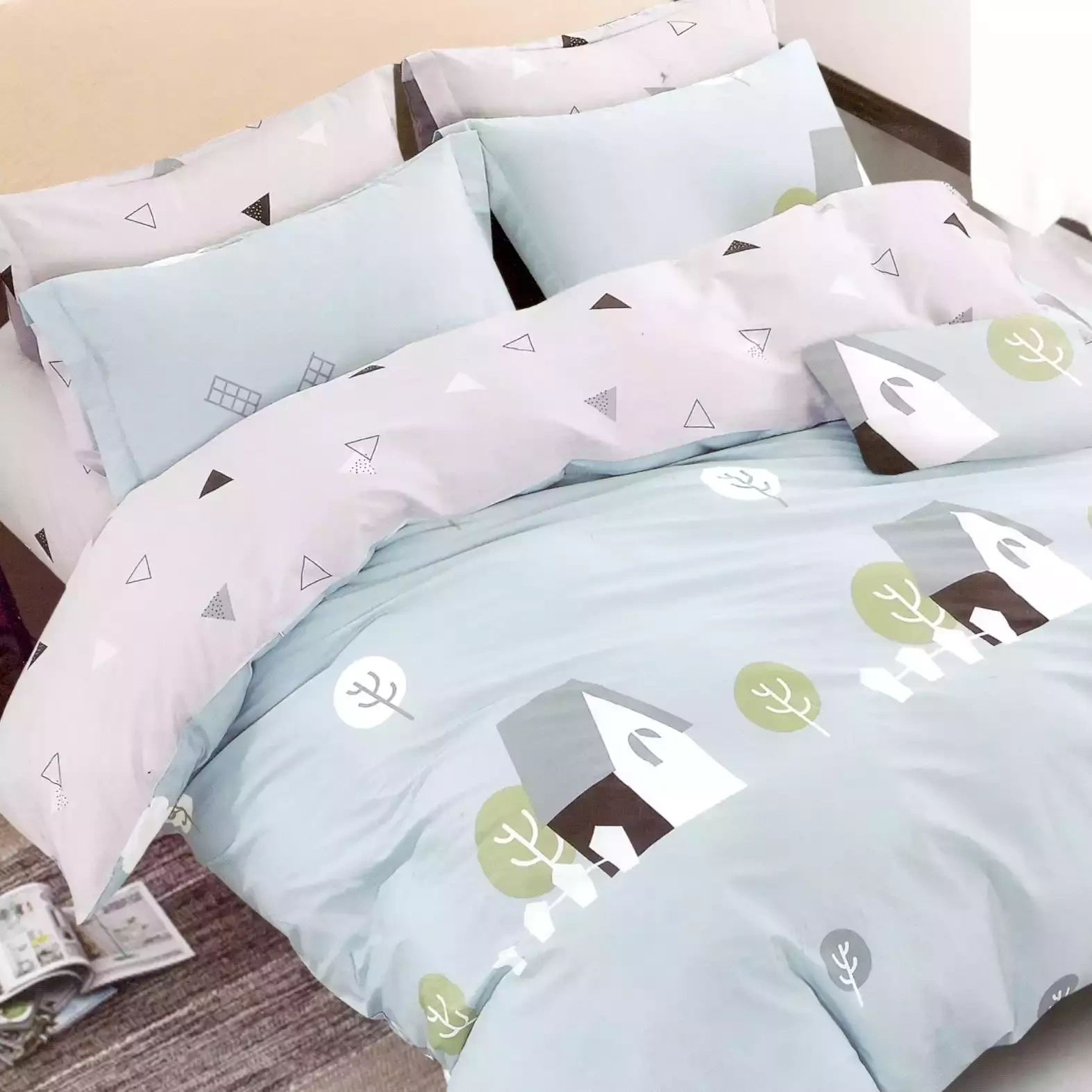 • Komplet pościeli bawełnianej 160x200 skład: 100% bawełna dwustronna poszewka na kołdrę i 2 x poszewka na poduszkę 70x80 pościel w domki i drzewka, pastelowe, delikatne kolory