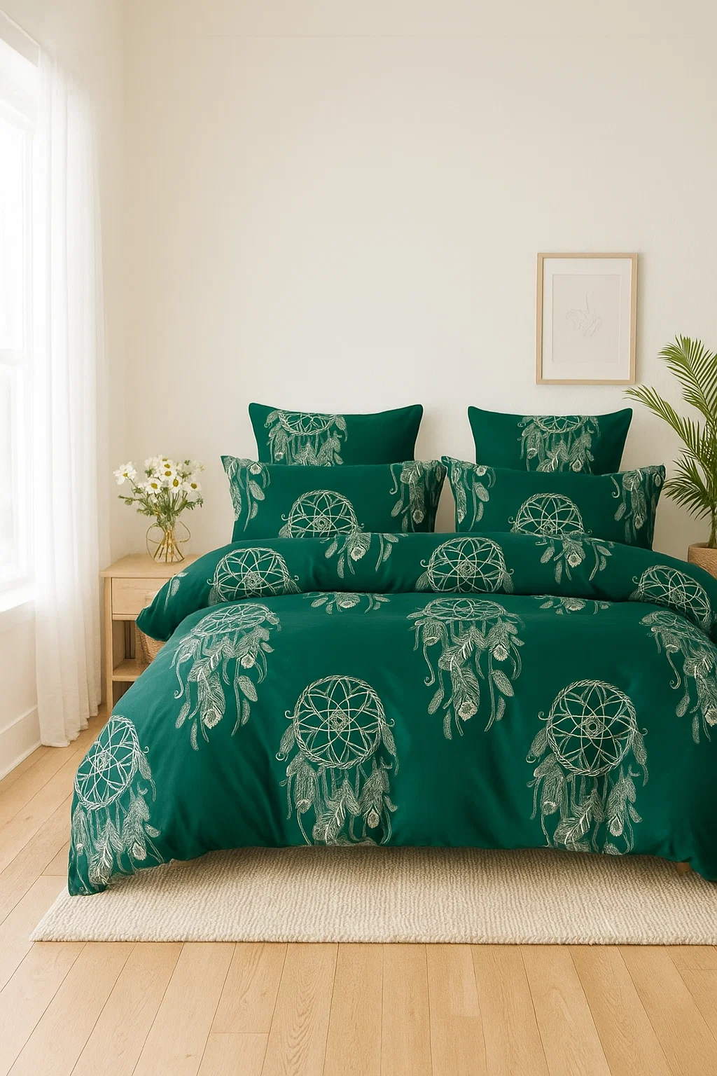 - Komplet pościeli butelkowej zielonej w łapacze snów to stylowy dodatek do każdej sypialni. Dzięki tej pościeli, sen staje się jeszcze bardziej przyjemny, a sypialnia nabiera wyjątkowego charakteru.