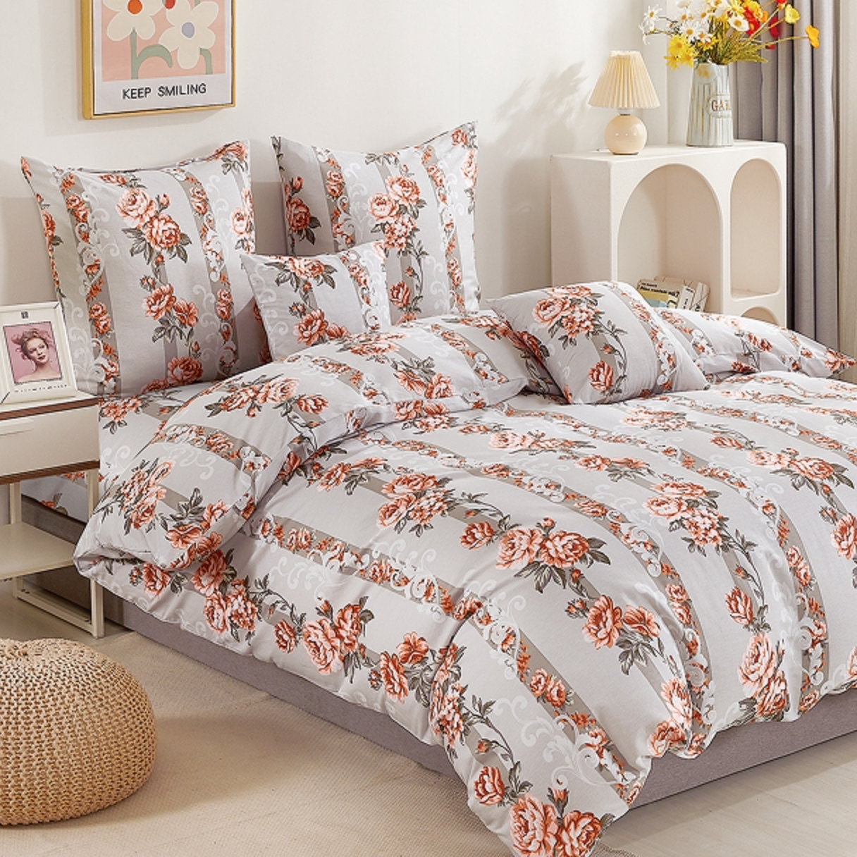 • Komplet naturalnej pościeli bawełnianej 160x200 skład: 100% bawełna dwustronna, poszewka na kołdrę i 2 x poszewka na poduszkę 70x80 pościel w kwiaty, szara, różowa