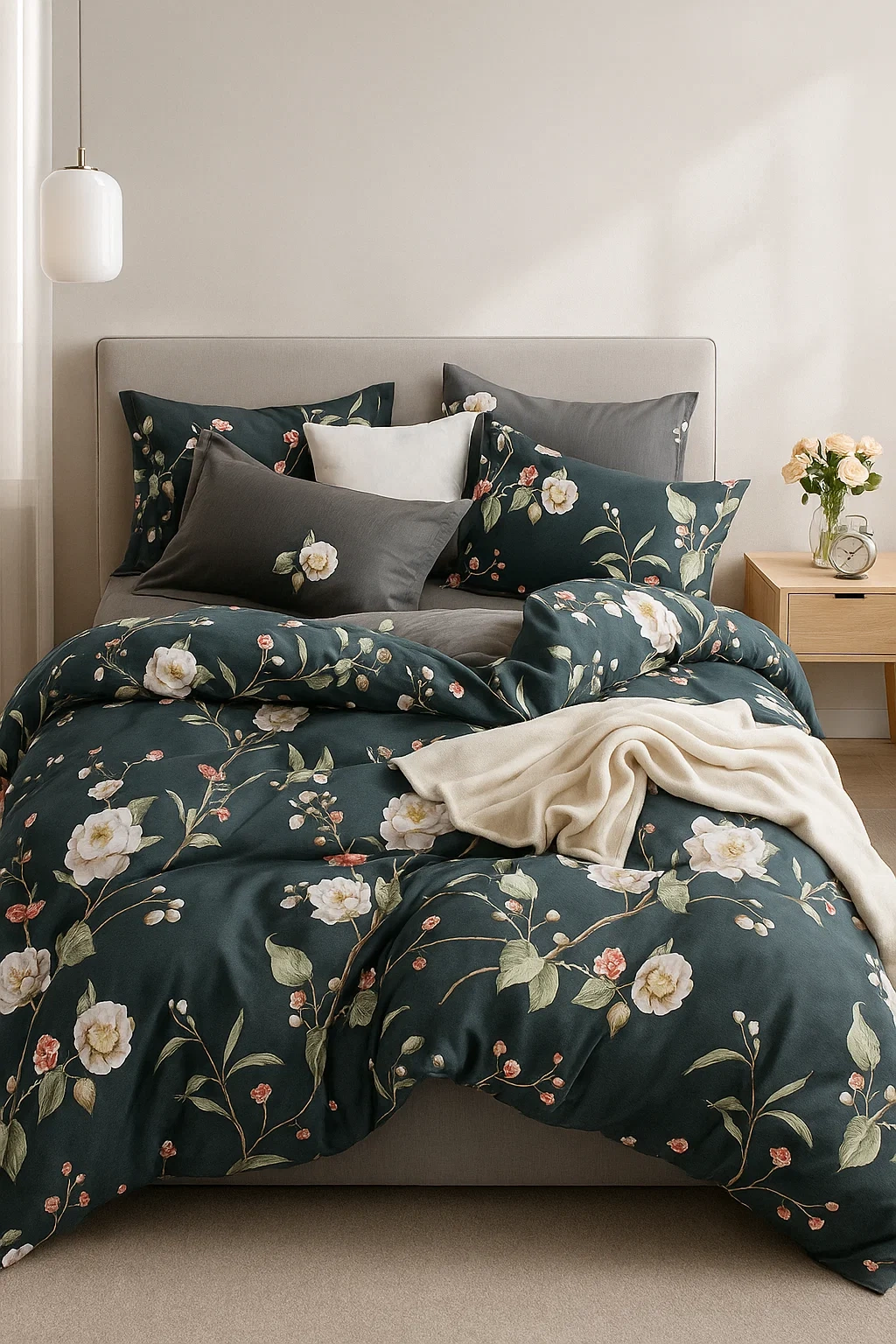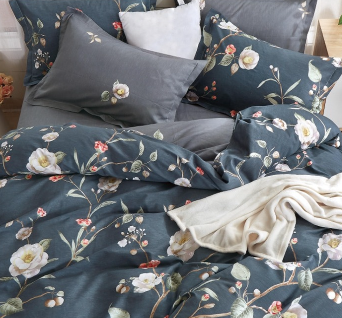 - Komplet naturalnej pościeli bawełnianej 160x200 skład: 100% bawełna dwustronna, poszewka na kołdrę i 2 x poszewka na poduszkę 70x80 ciemna szara w kwiaty