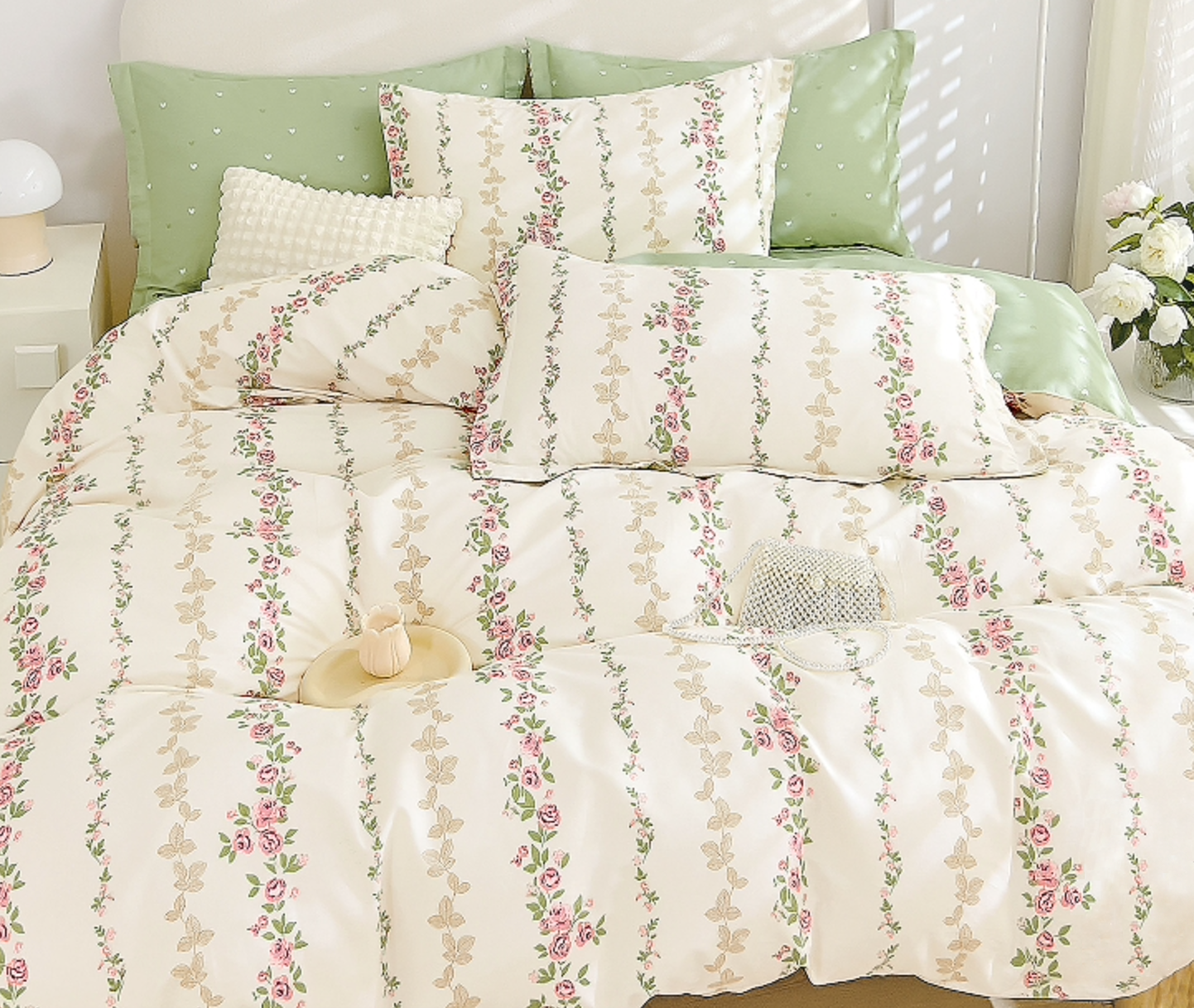 • Komplet naturalnej pościeli bawełnianej 160x200 skład: 100% bawełna dwustronna, poszewka na kołdrę i 2 x poszewka na poduszkę 70x80 ecru, zielona w kwiatki