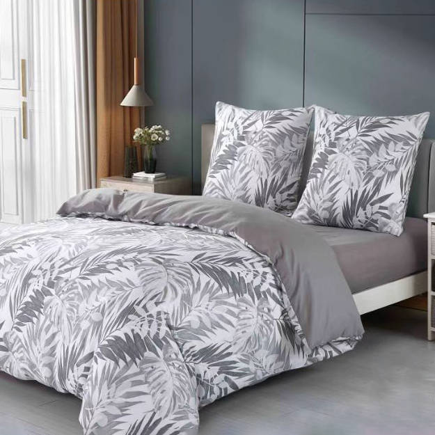 • Komplet naturalnej pościeli bawełnianej 160x200 skład: 100% bawełna dwustronna, poszewka na kołdrę i 2 x poszewka na poduszkę 70x80, szara, elegancka pościel w liście palmy, monstery