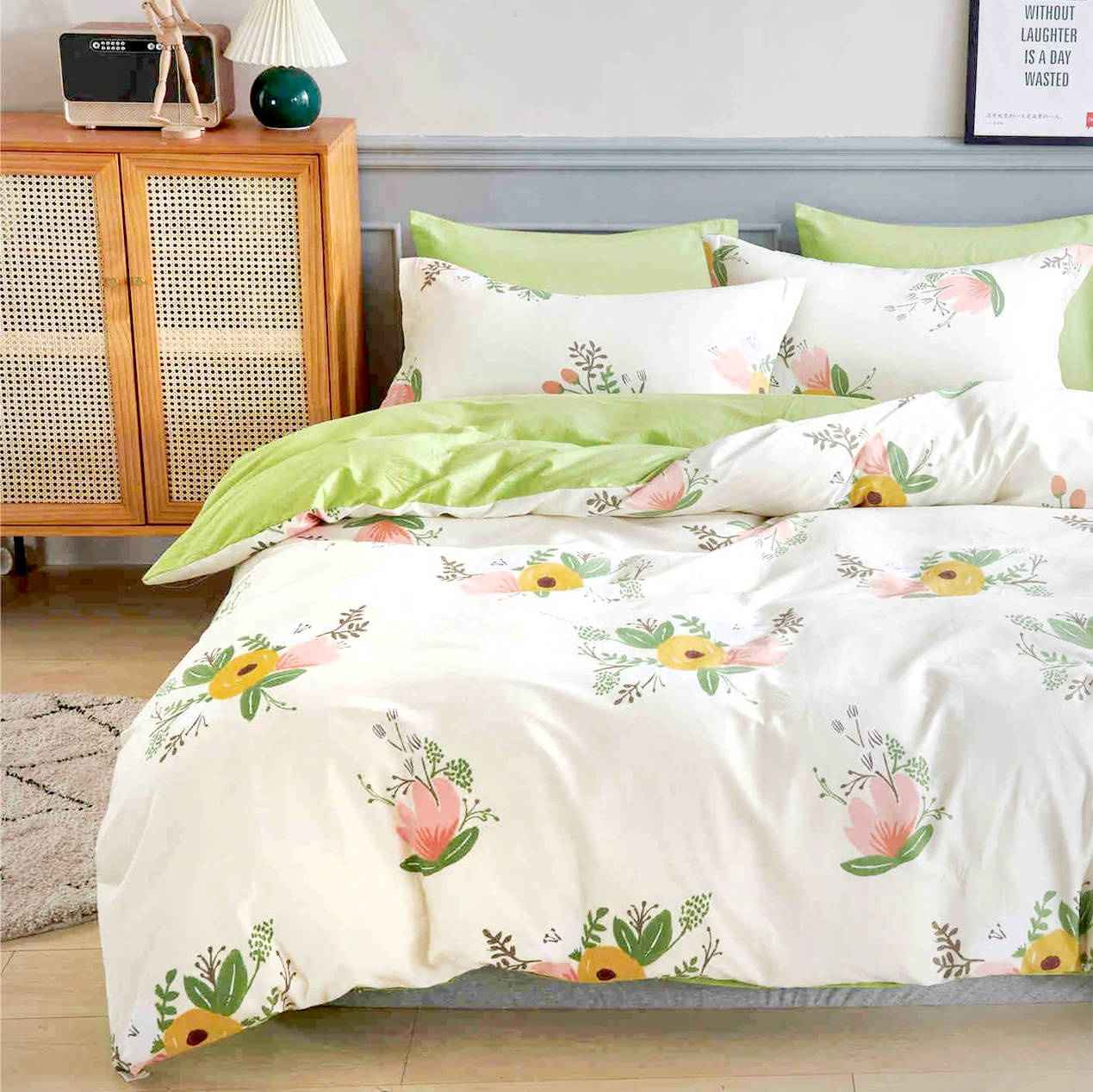 Kolory tła pościeli inny niż na zdjęciu, nie jest biały, tylko seledynowoszary.
