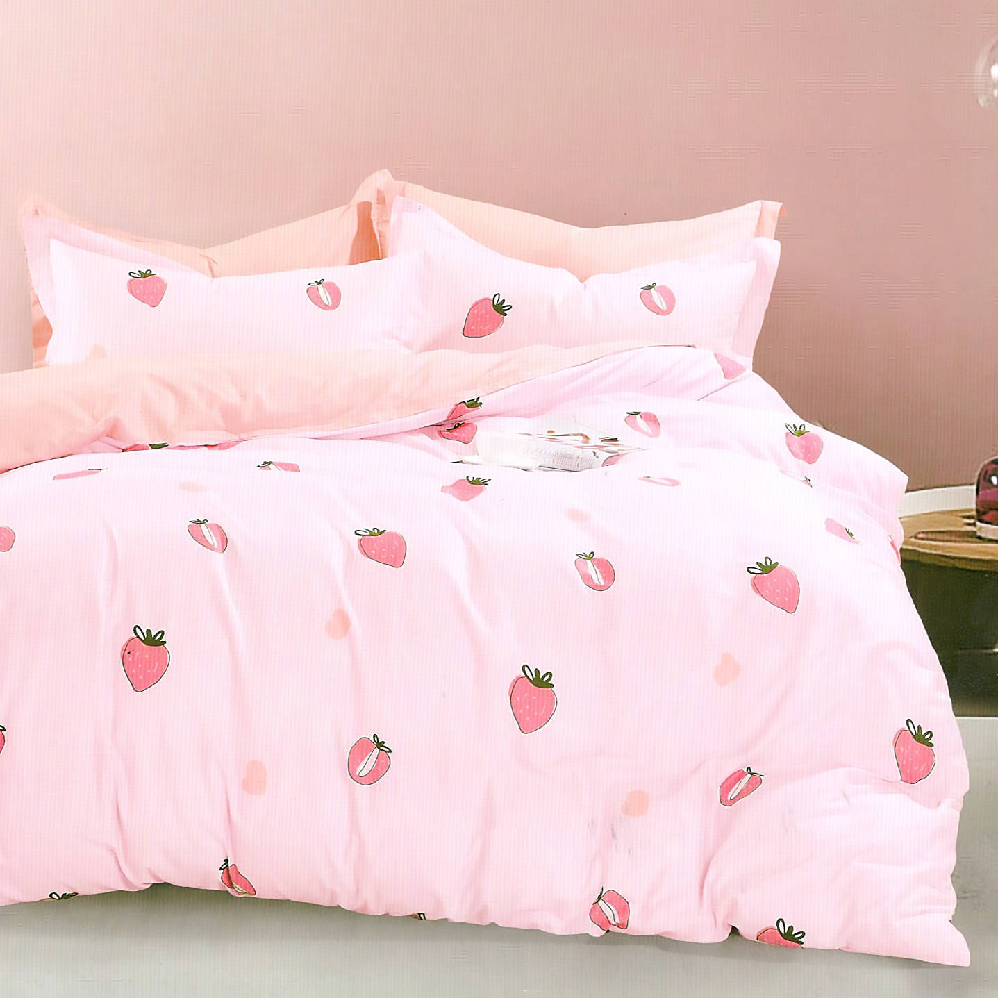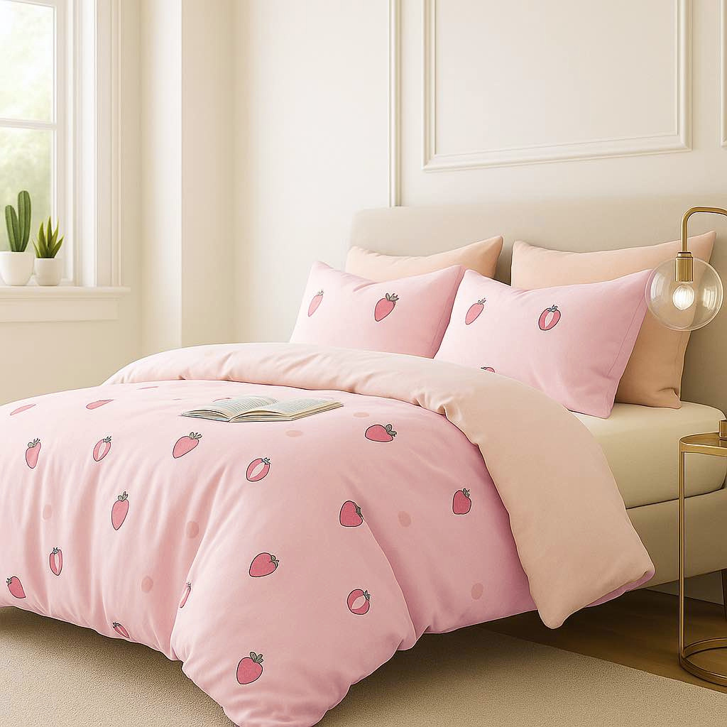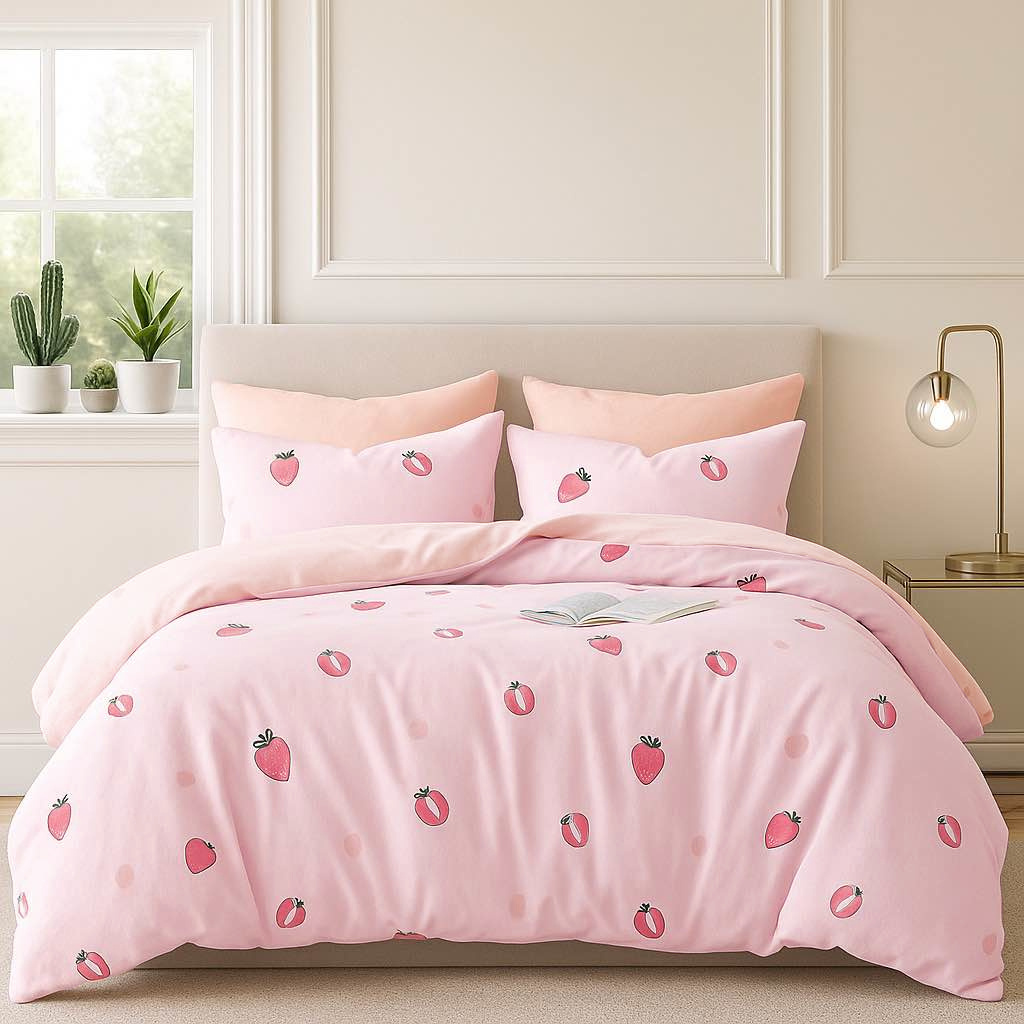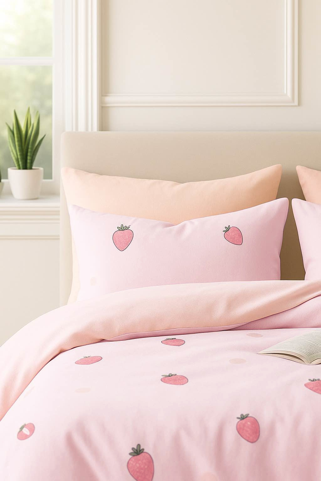 • Komplet pościeli bawełnianej 160x200 skład: 100% bawełna dwustronna poszewka na kołdrę i 2 x poszewka na poduszkę 70x80 różowa pościel w truskawki