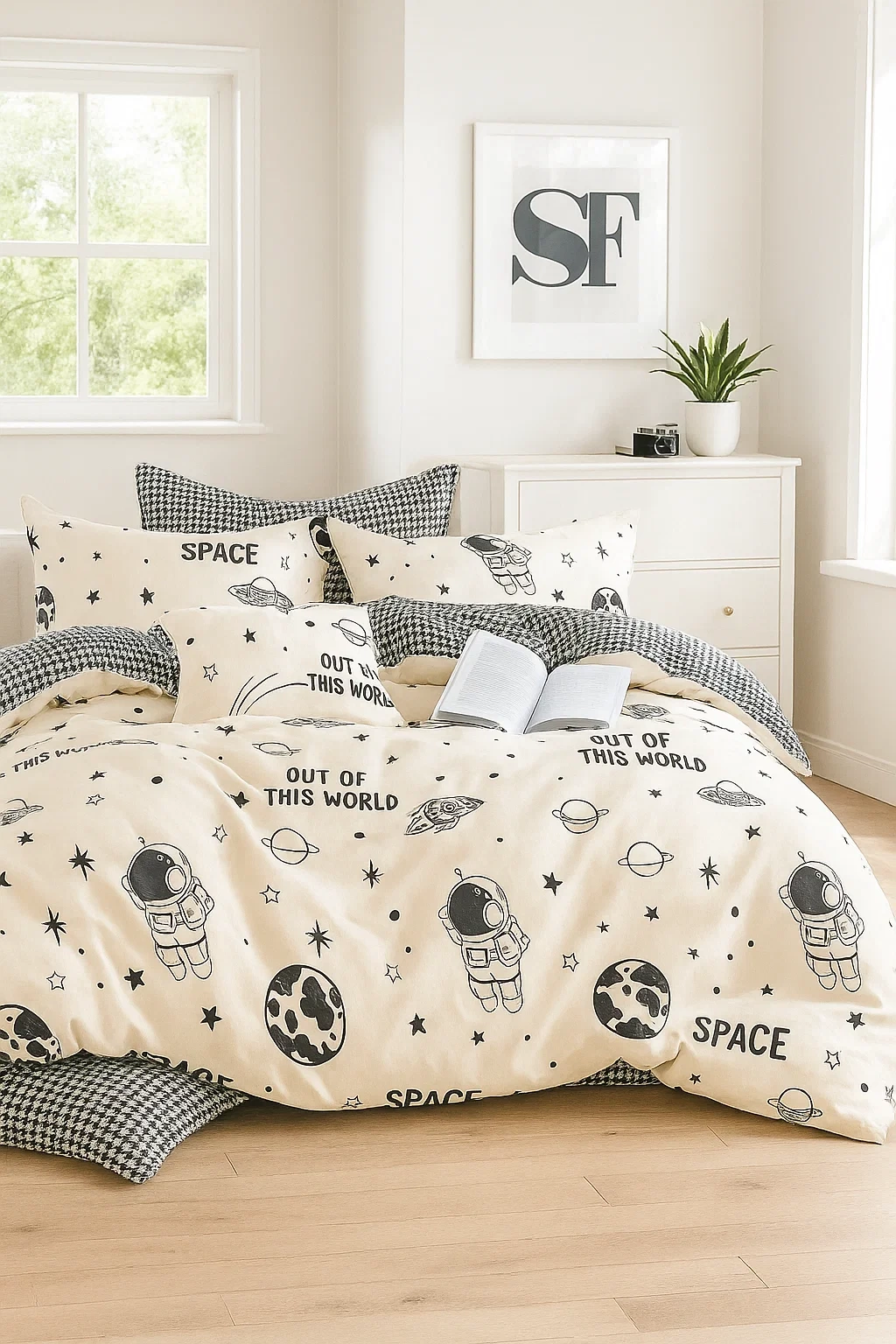 - Komplet naturalnej pościeli bawełnianej 160x200 skład: 100% bawełna dwustronna, poszewka na kołdrę i 2 x poszewka na poduszkę 70x80, dziecięca, młodzieżowa kosmos