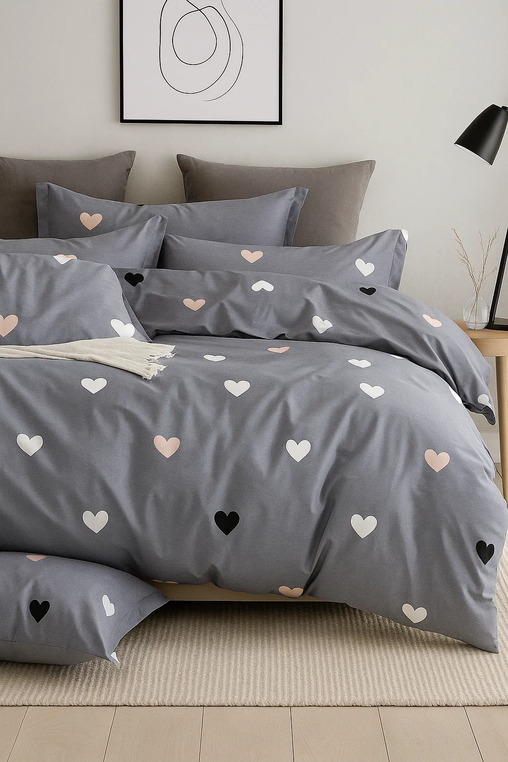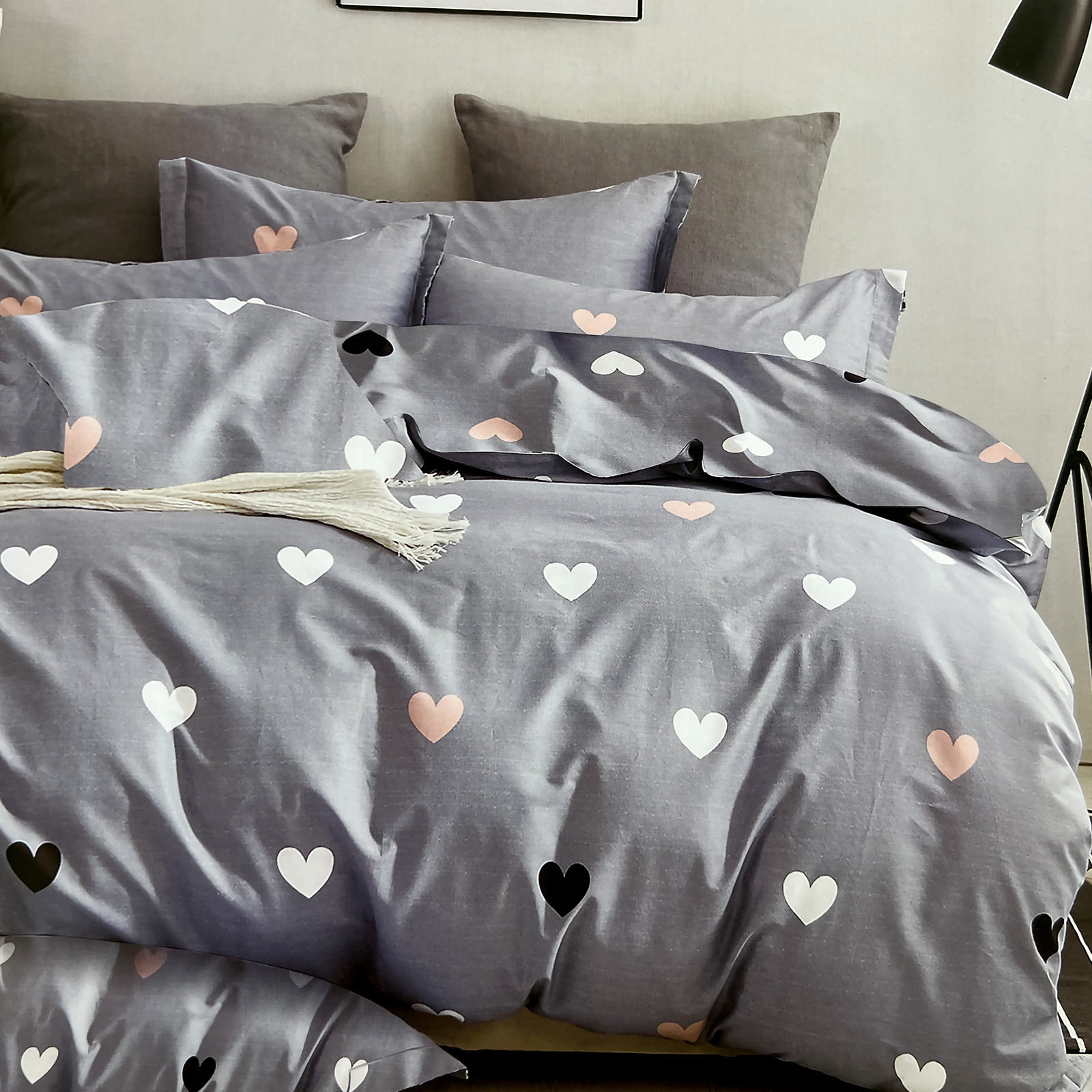 • Komplet pościeli bawełnianej 180x200 skład: 100% bawełna dwustronna poszewka na kołdrę i 2 x poszewka na poduszkę 70x80 szara pościel w serca