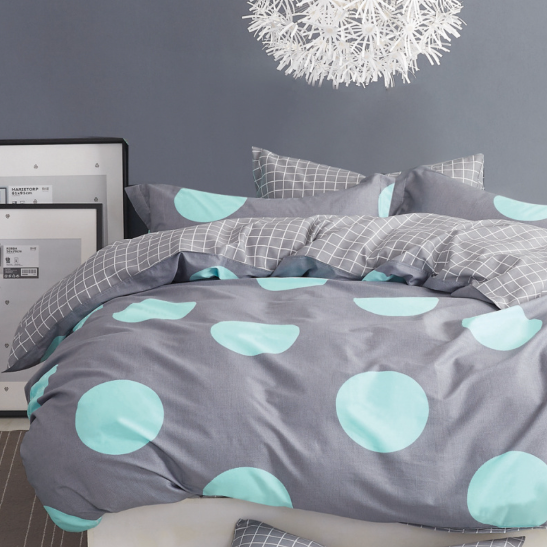 • Komplet pościeli bawełnianej 180x200 skład: 100% bawełna dwustronna poszewka na kołdrę i 2 x poszewka na poduszkę 70x80 szara pościel w miętowe kółka