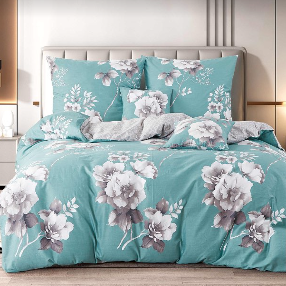 • Komplet naturalnej pościeli bawełnianej 180x200 skład: 100% bawełna dwustronna, poszewka na kołdrę i 2 x poszewka na poduszkę 70x80 turkusowa w kwiaty