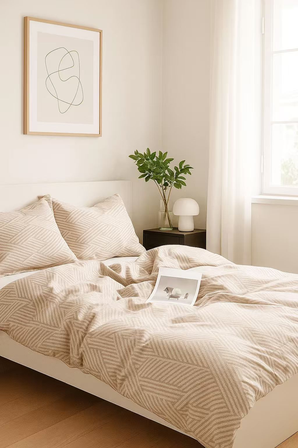 • Komplet naturalnej pościeli bawełnianej 180x200 skład: 100% bawełna dwustronna, poszewka na kołdrę i 2 x poszewka na poduszkę 70x80 pościel geometryczna, beżowa