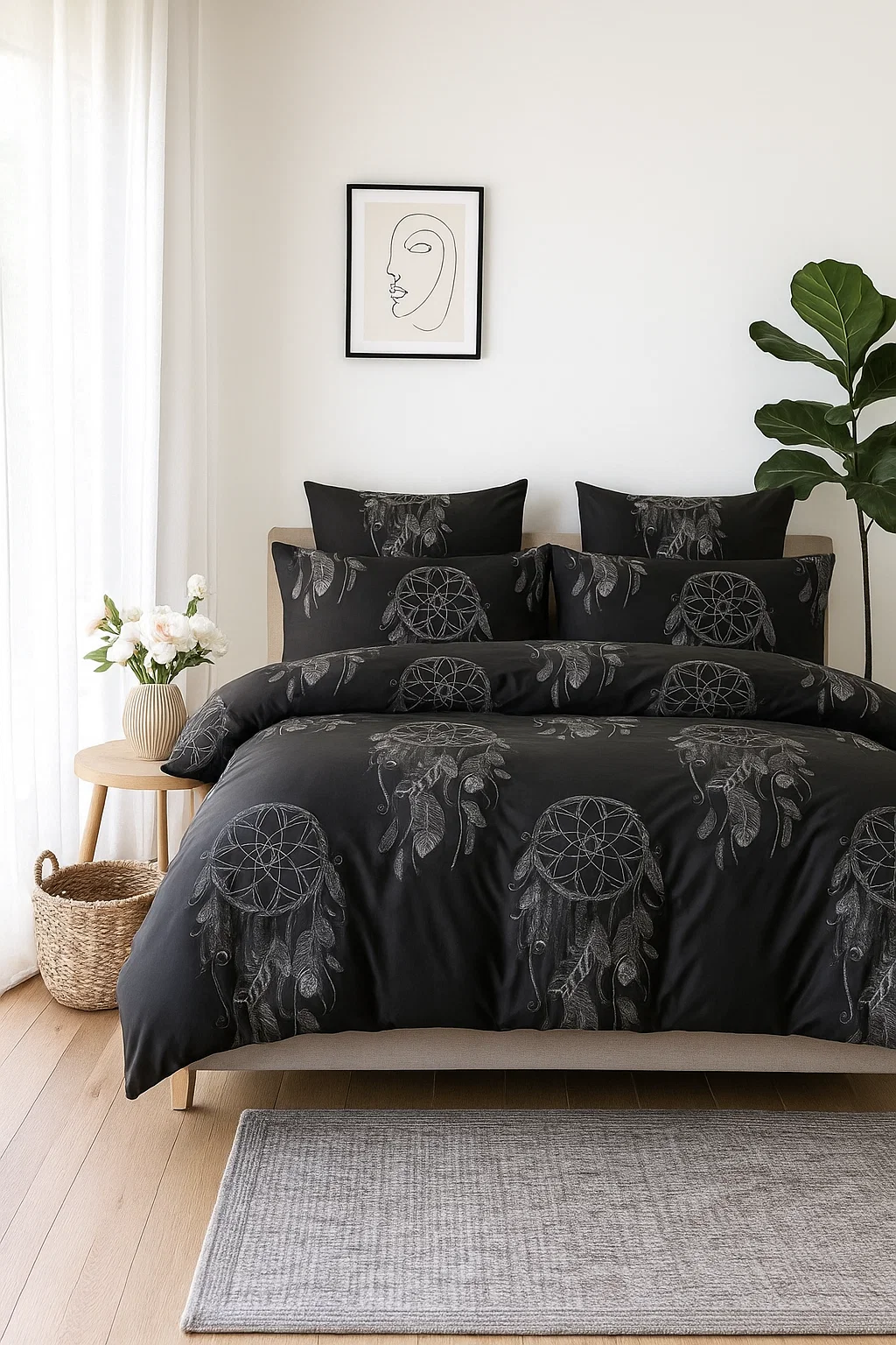 - Komplet pościeli ciemnej szarej w łapacze snów to stylowy dodatek do każdej sypialni. Dzięki tej pościeli, sen staje się jeszcze bardziej przyjemny, a sypialnia nabiera wyjątkowego charakteru.