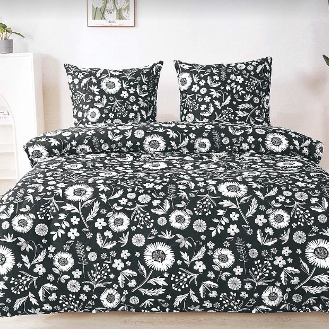- Komplet naturalnej pościeli bawełnianej 180x200 skład: 100% bawełna dwustronna, poszewka na kołdrę i 2 x poszewka na poduszkę 70x80, czarna w kwiaty