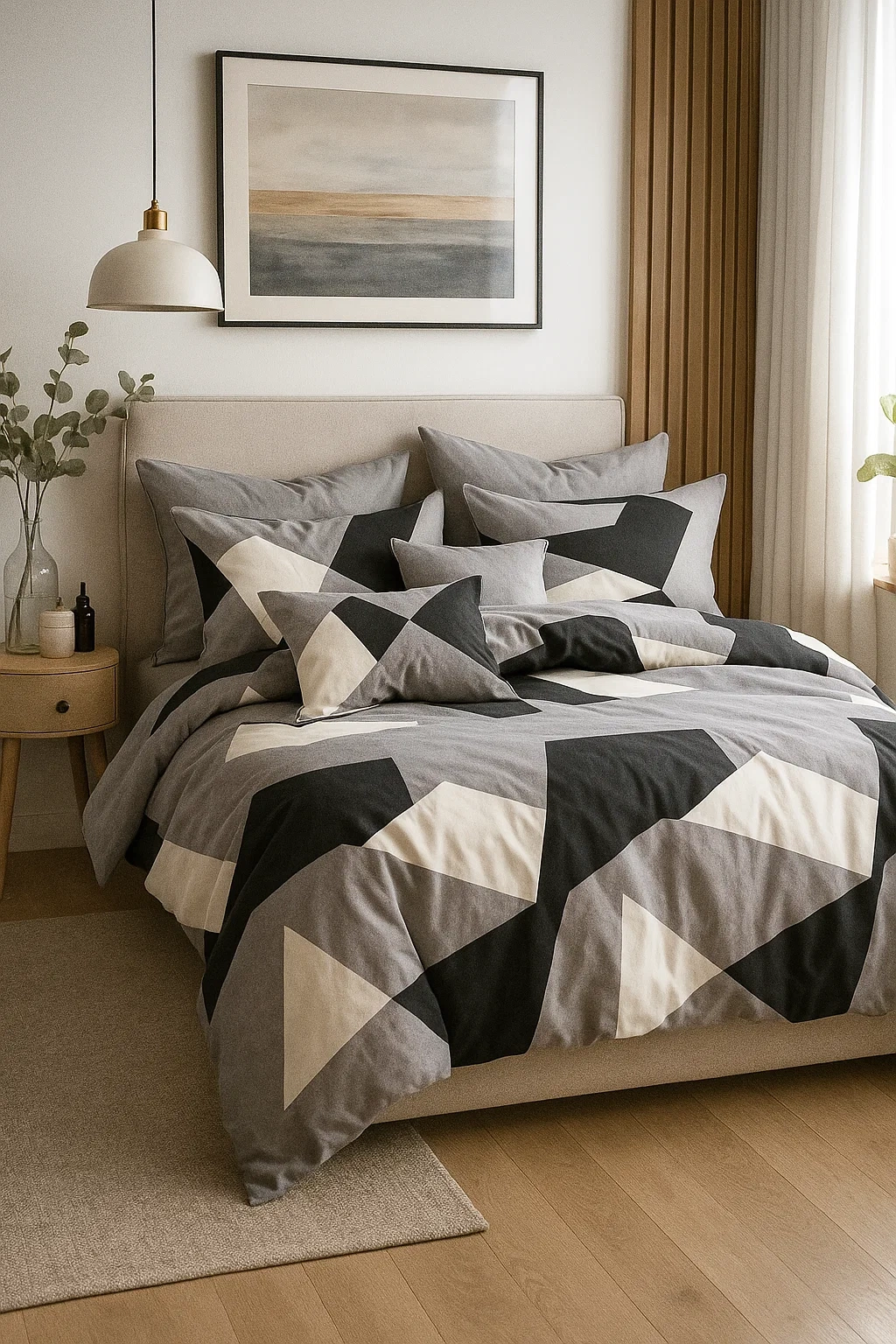 - Komplet naturalnej pościeli bawełnianej 200x220 skład: 100% bawełna dwustronna, poszewka na kołdrę i 2 x poszewka na poduszkę 70x80 pościel geometryczna, szara