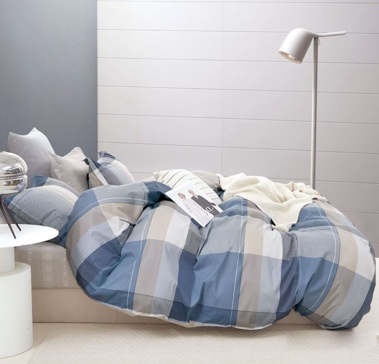 - Komplet niebieskiej pościeli w kratę, w nowoczesny geometryczny wzór. Dzięki tej pościeli, sen staje się jeszcze bardziej przyjemny, a sypialnia nabiera wyjątkowego charakteru.