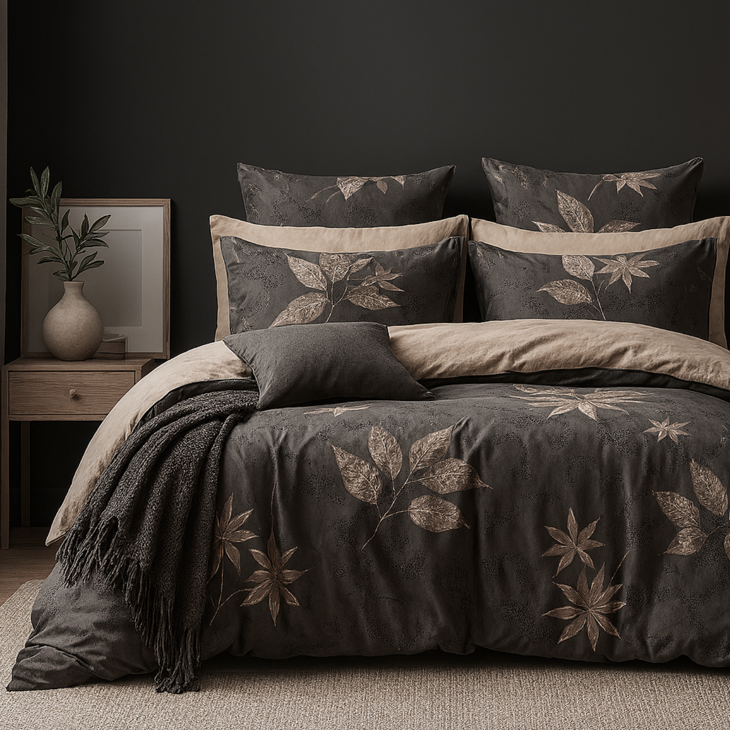 • Komplet pościeli bawełnianej w liście 200x220 skład: 100% bawełna dwustronna, poszewka na kołdrę i 2 x poszewka na poduszkę 70x80, ciemna szara, beżowa