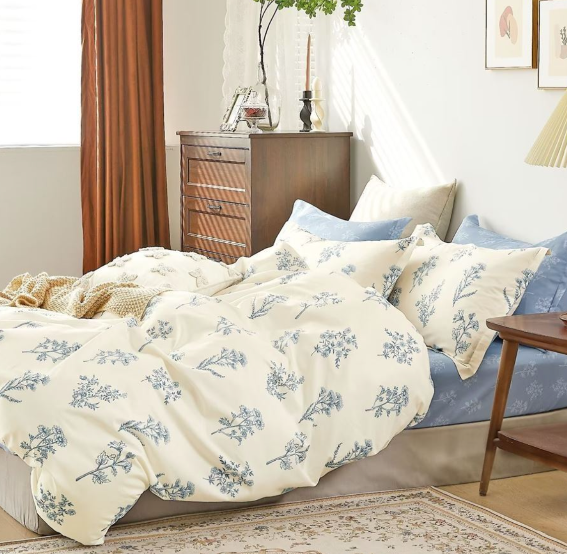 • Komplet pościeli ecru w kwiaty to romantyczny dodatek do każdej sypialni. Na drugiej stronie ma delikatny odcień błękitu. Dzięki tej pościeli, sen staje się jeszcze bardziej przyjemny, a sypialnia nabiera wyjątkowego charakteru.