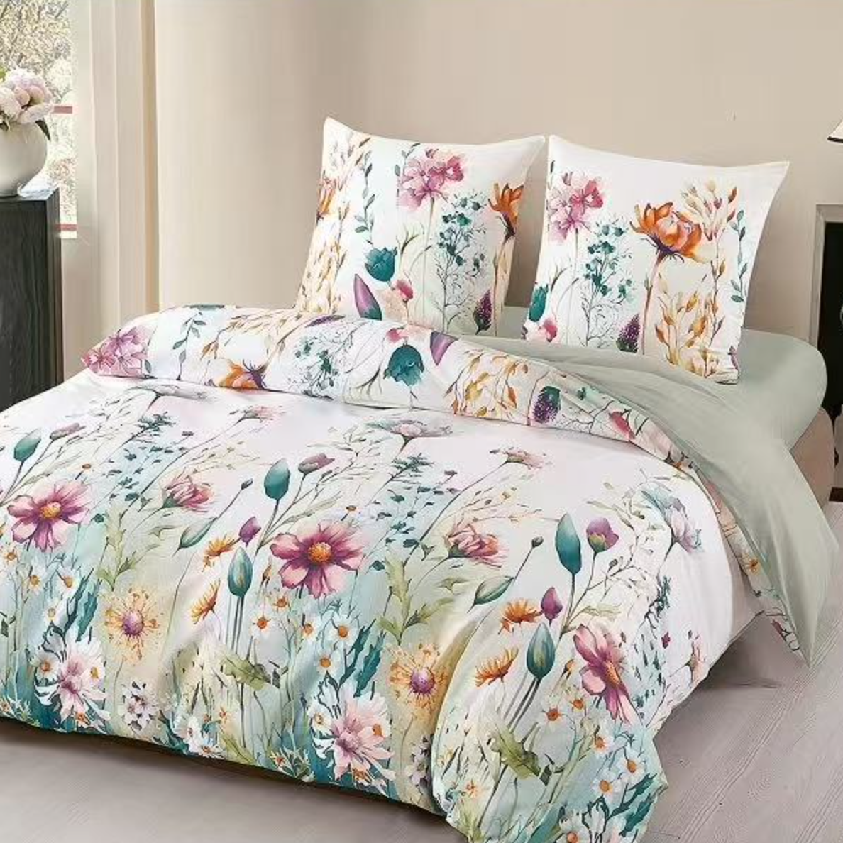 - Komplet pościeli bawełnianej 200x220 skład: 100% bawełna dwustronna, poszewka na kołdrę i 2 x poszewka na poduszkę 70x80, biała, zielona w kwiaty