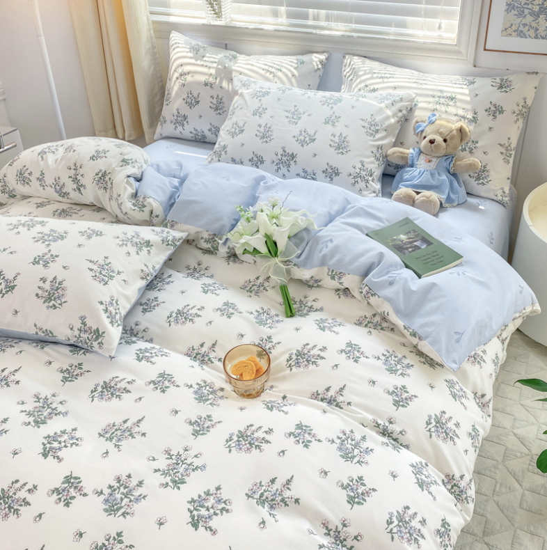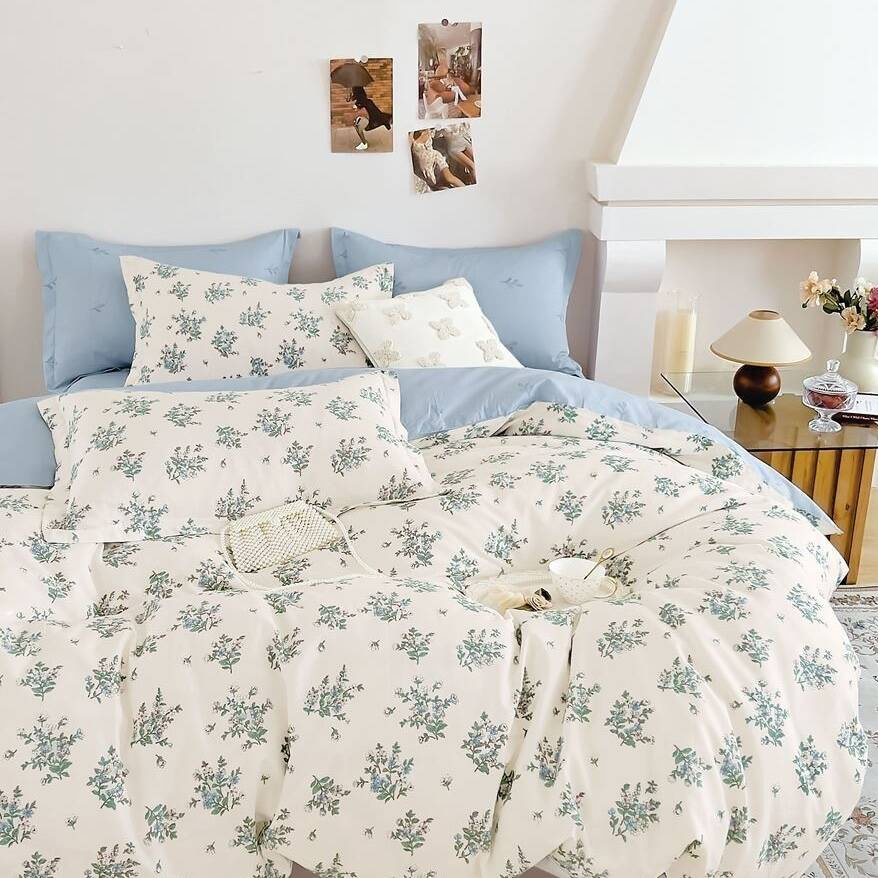 • Komplet pościeli bawełnianej 200x220, skład: 100% bawełna dwustronna kolorowa poszewka na kołdrę i 2 x poszewka na poduszkę 70x80, pościel w kwiaty, błękitna, kremowa