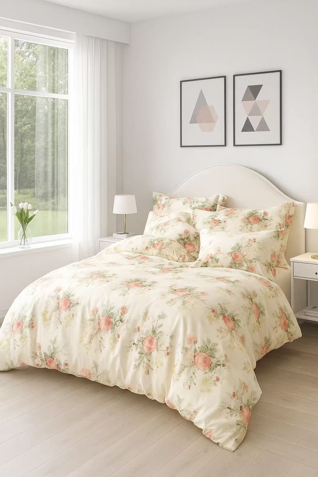 - Komplet pościeli bawełnianej 200x220, skład: 100% bawełna dwustronna kolorowa poszewka na kołdrę i 2 x poszewka na poduszkę 70x80, pościel w kwiaty, kremowa