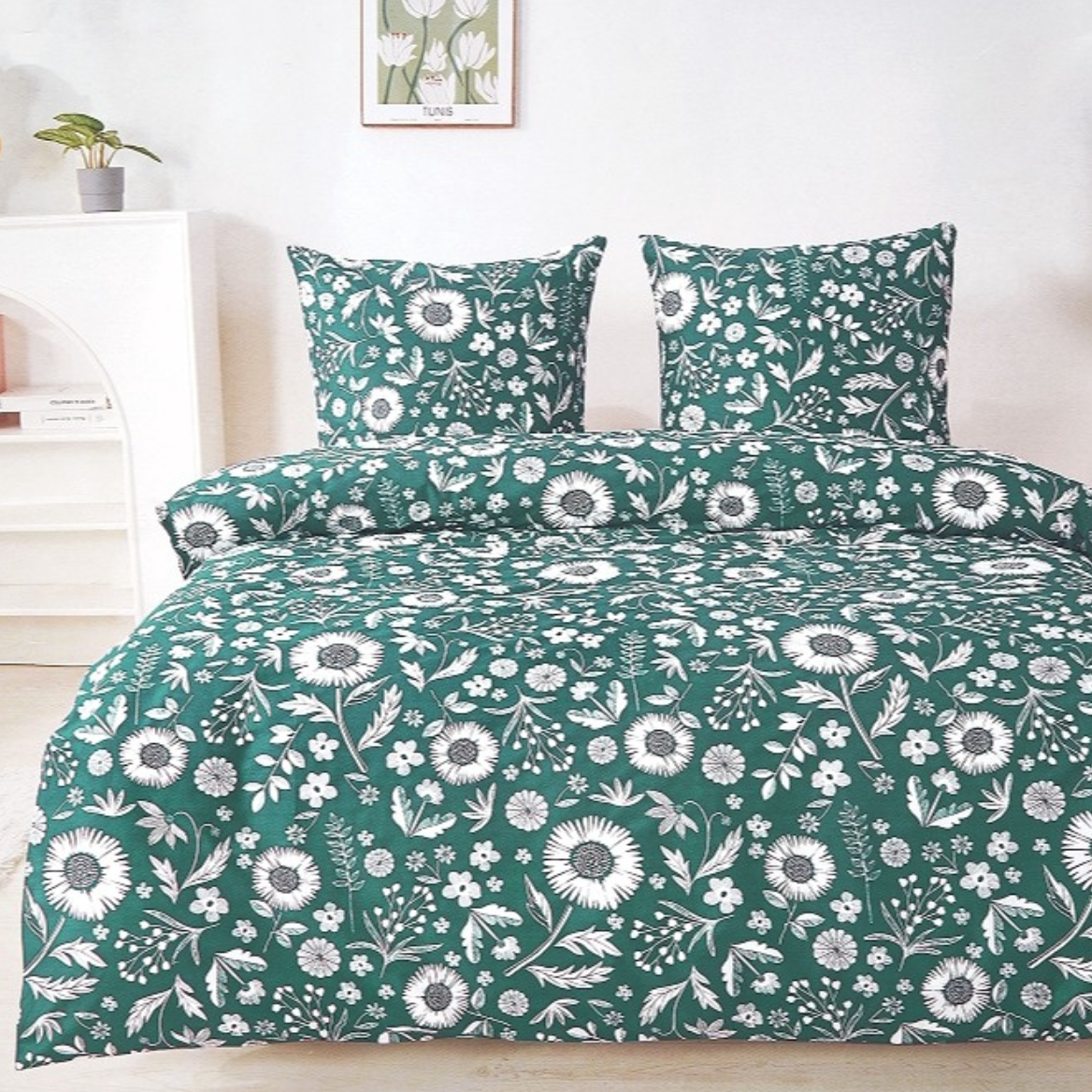 - Komplet naturalnej pościeli bawełnianej 200x220 skład: 100% bawełna dwustronna, poszewka na kołdrę i 2 x poszewka na poduszkę 70x80, ciemna zielona w kwiaty