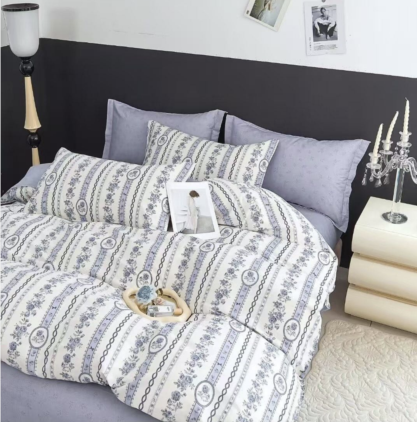 Pościel bawełniana biało-błękitna w kwiatki 160x200 3 el. L29