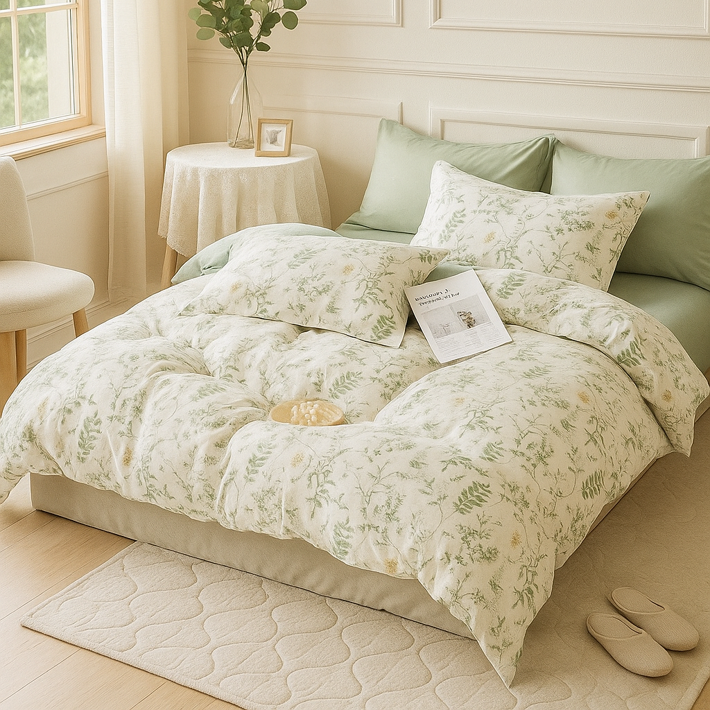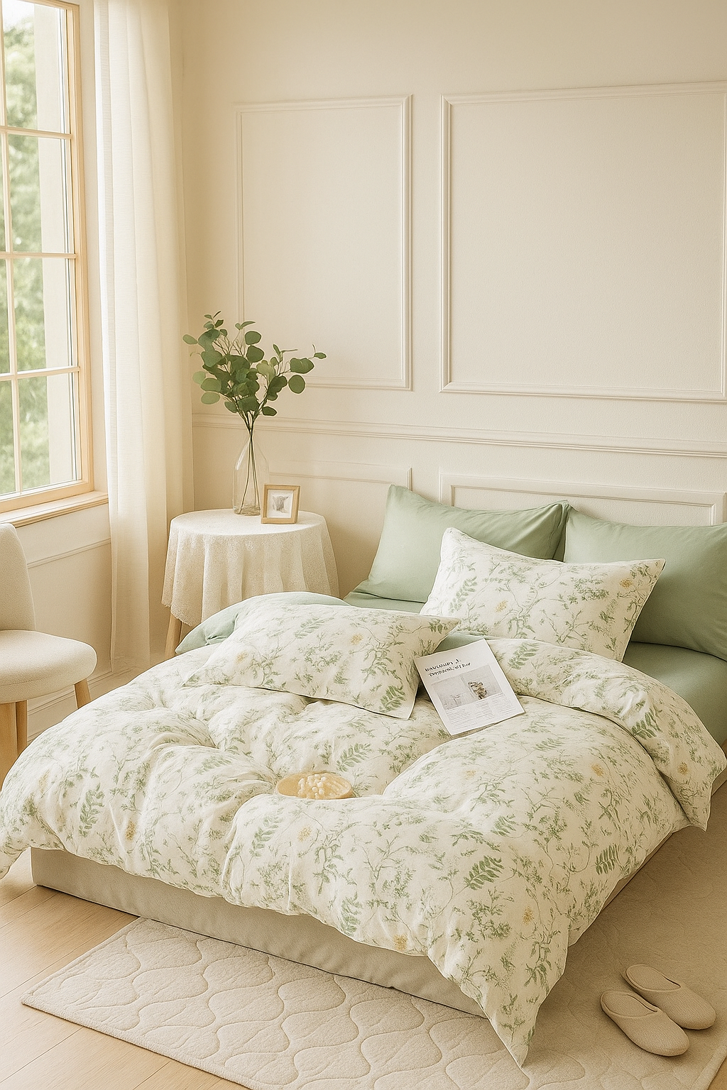 - Miękka, 100% bawełniana pościel z dwustronnym nadrukiem i zamkiem błyskawicznym. Oddychająca, przyjazna dla skóry, idealna na każdą porę roku. Wzorzysta biało-zielona pościel w kwiatki i liście.