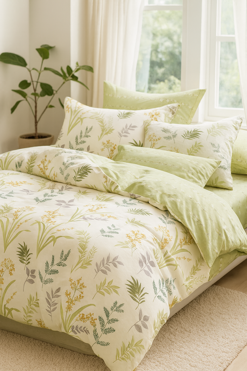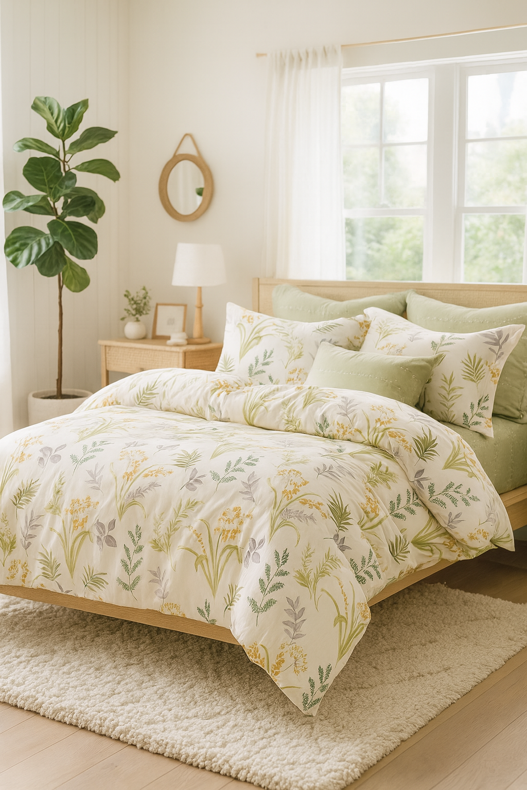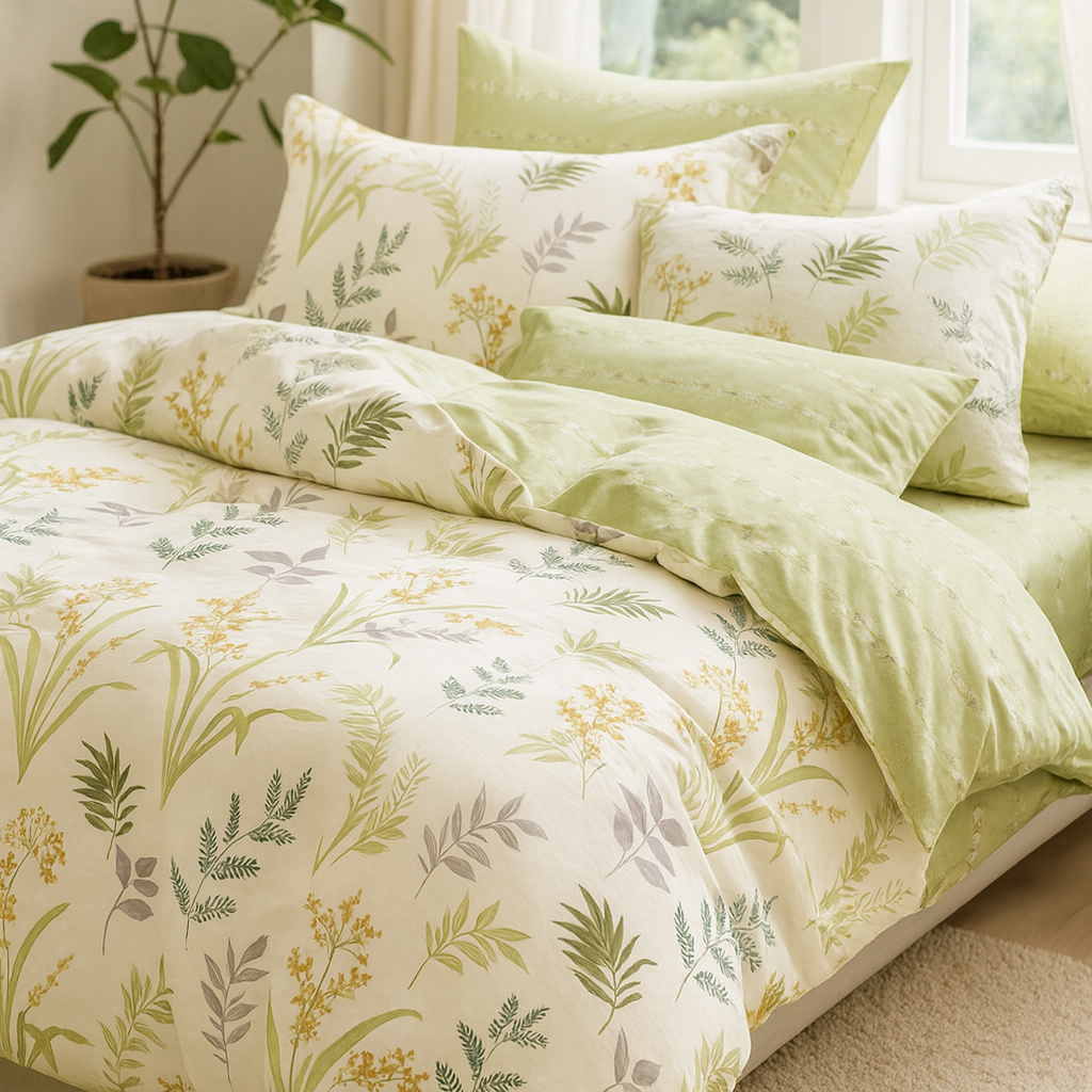 - Miękka, 100% bawełniana pościel z dwustronnym nadrukiem i zamkiem błyskawicznym. Oddychająca, przyjazna dla skóry, idealna na każdą porę roku. Wzorzysta biało-zielona pościel w kwiatki i liście.
