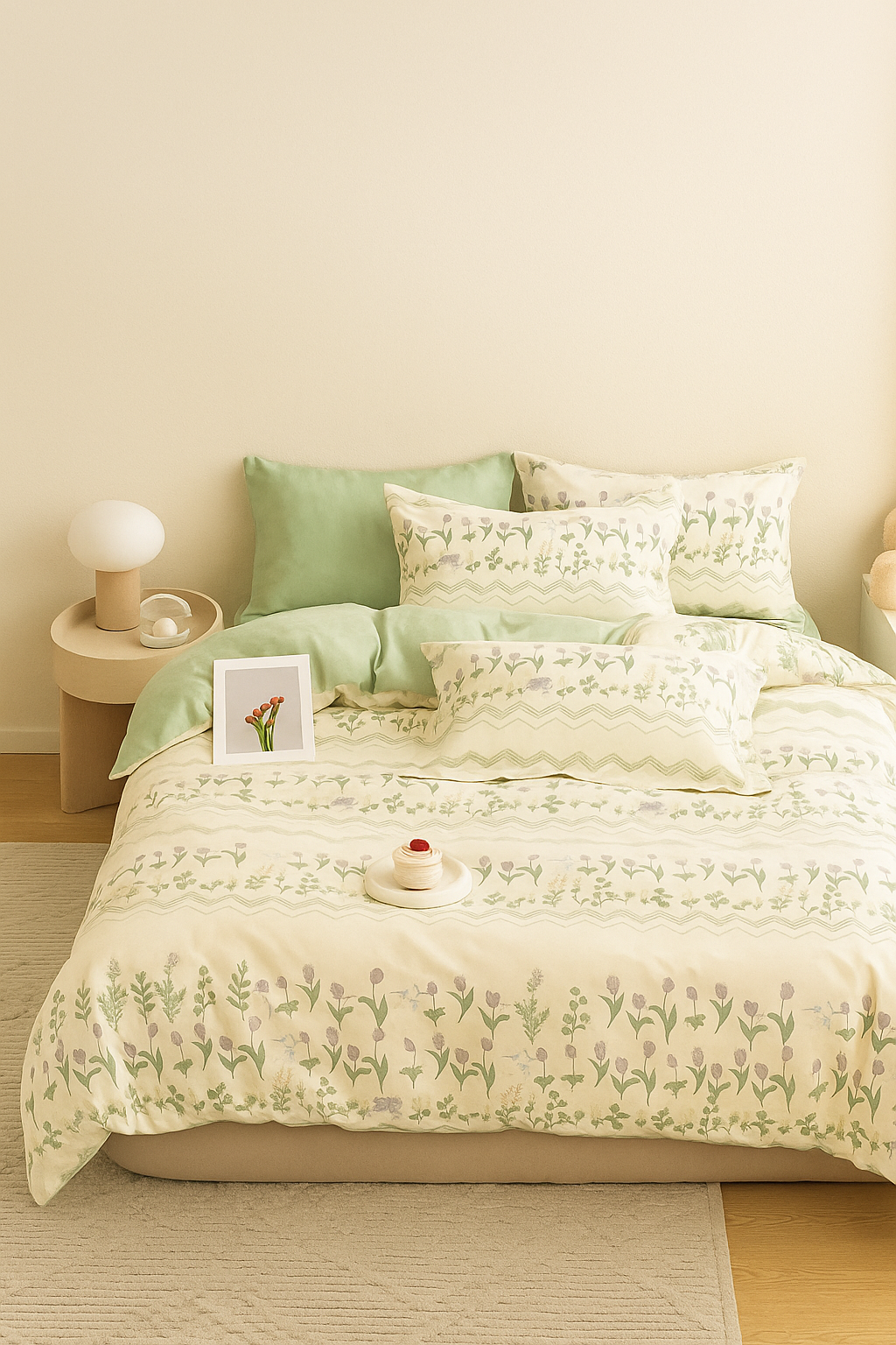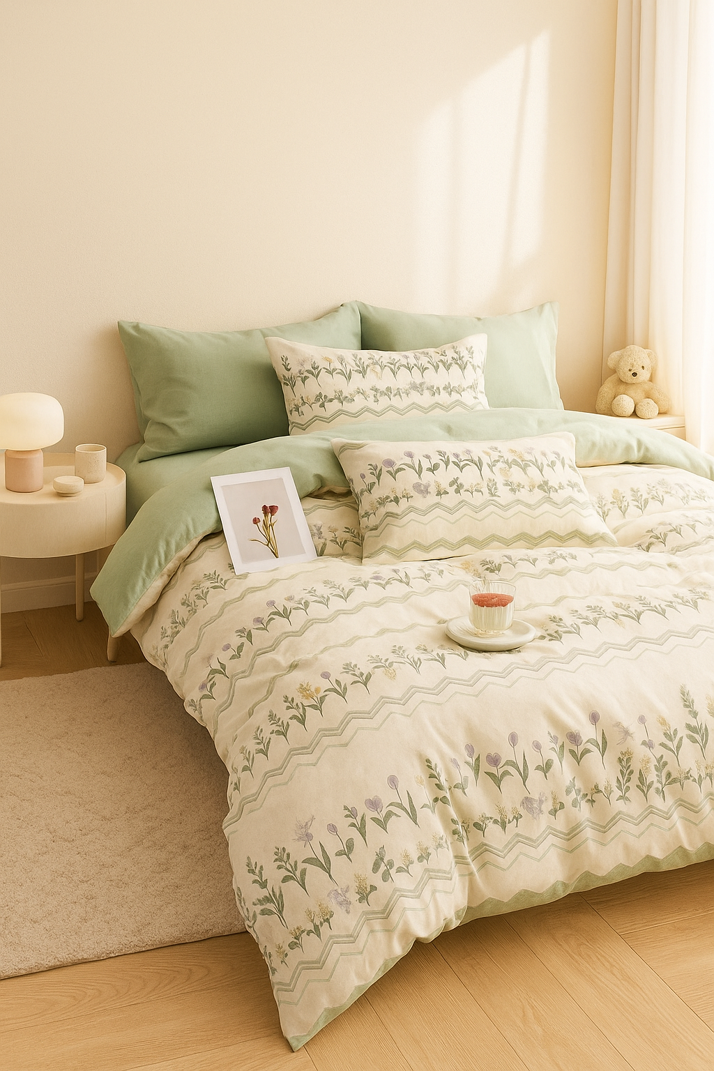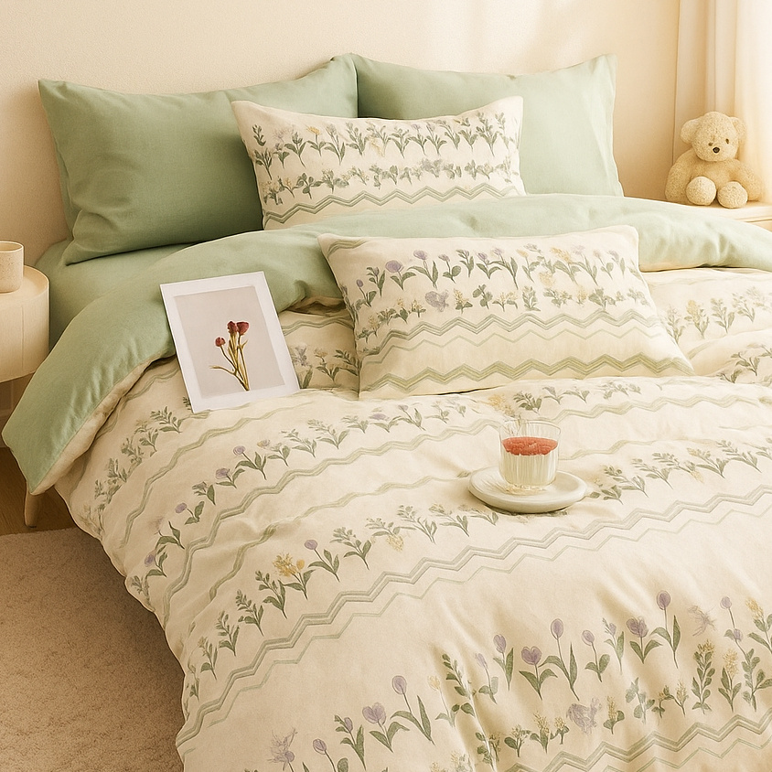 - Miękka, 100% bawełniana pościel z dwustronnym nadrukiem i zamkiem błyskawicznym. Oddychająca, przyjazna dla skóry, idealna na każdą porę roku. Wzorzysta biało-zielona pościel w kwiatki i liście.