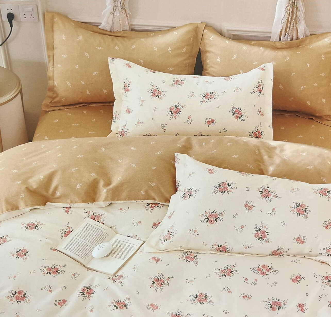 • Komplet pościeli bawełnianej beżowo-kremowej w kwiaty w rozmiarze 180x200!