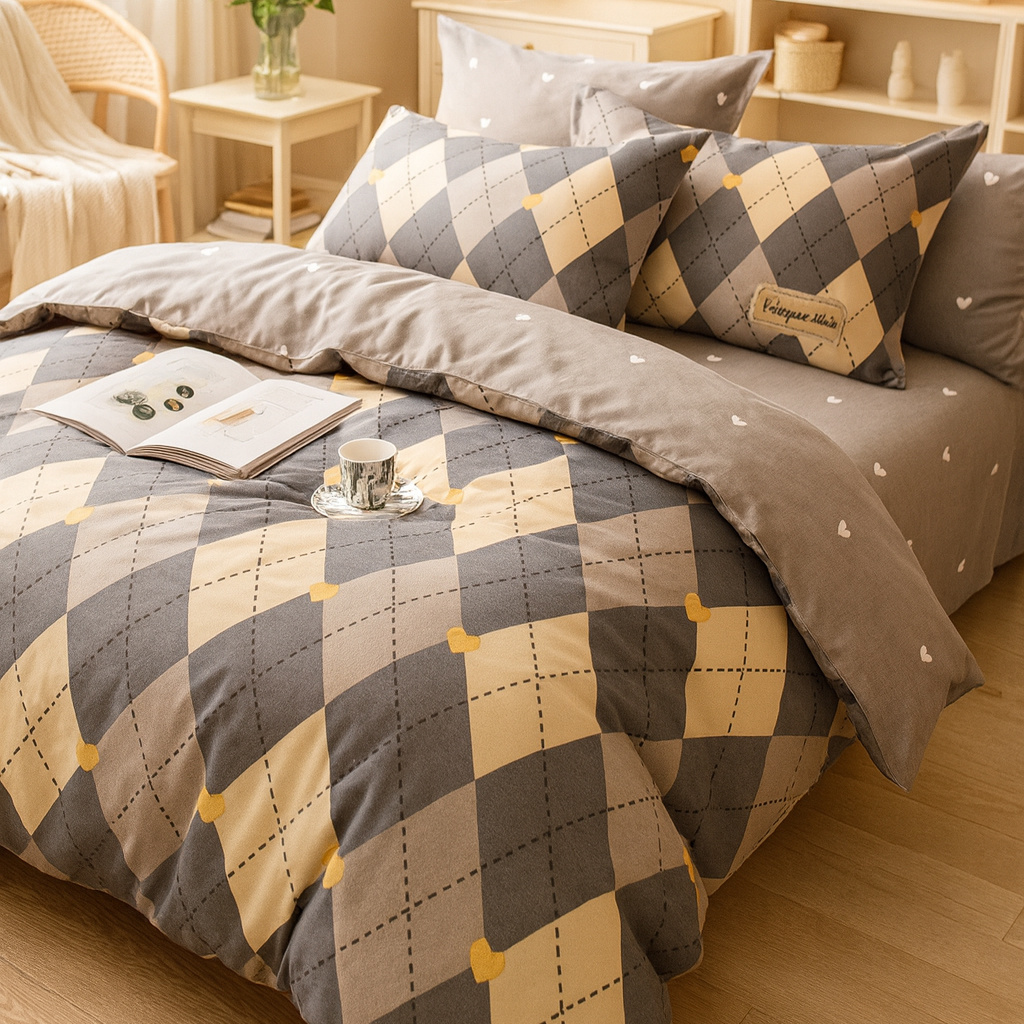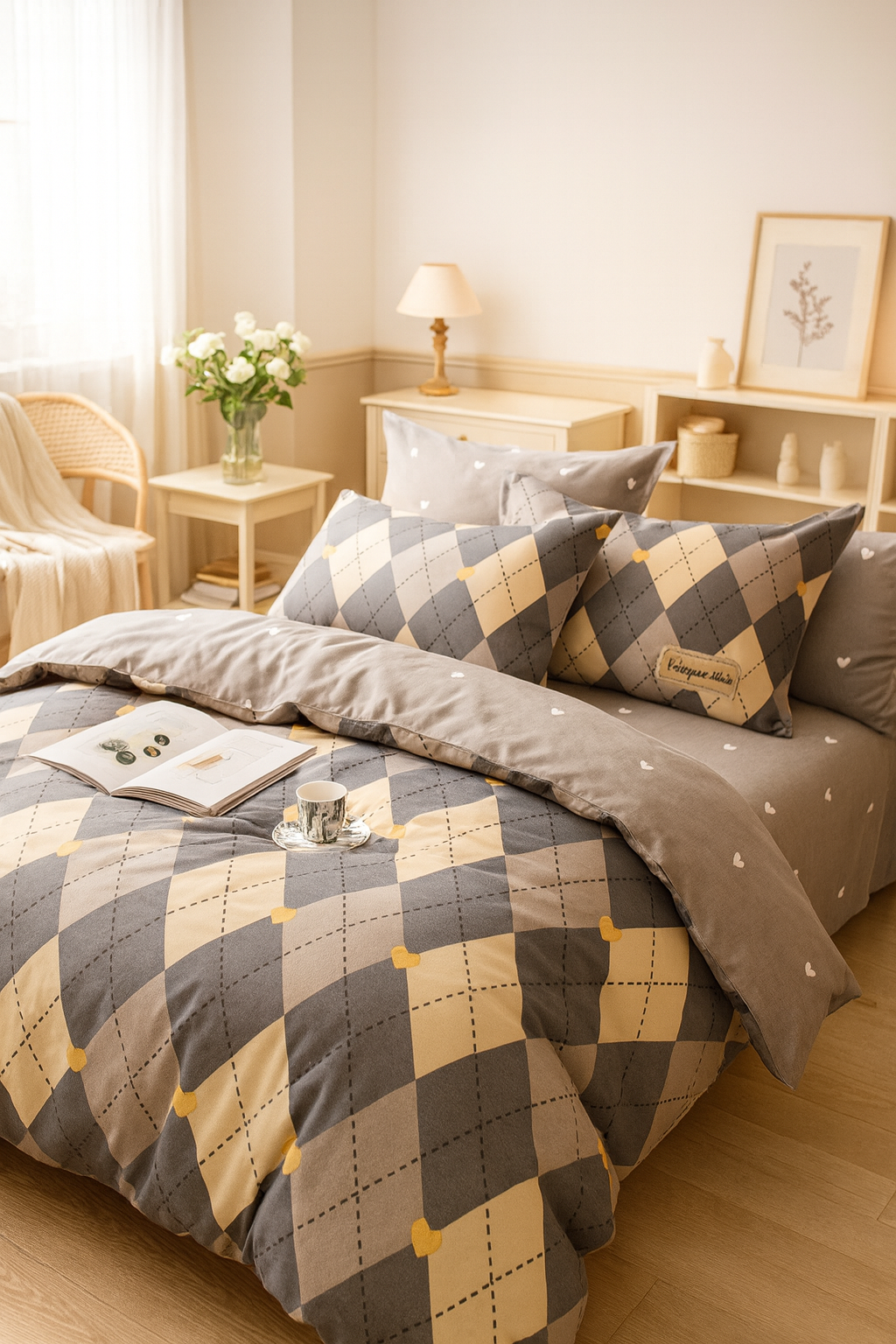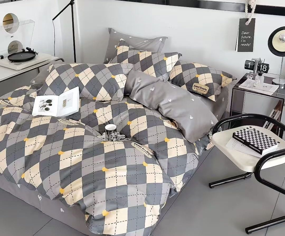 Pościel bawełniana szaro żółta w romby 160x200 3 el. L61