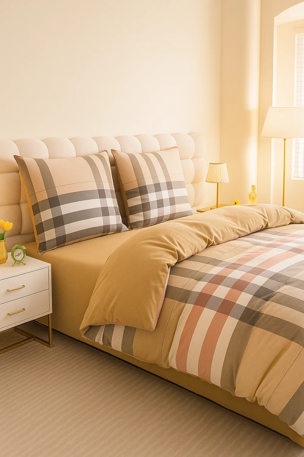 • Modny komplet pościeli bawełnianej w kratkę 200x220 skład: 100% bawełna dwustronna, poszewka na kołdrę i 2 x poszewka na poduszkę 70x80. Pościel kraciasta beżowa, nowoczesna i elegancka.