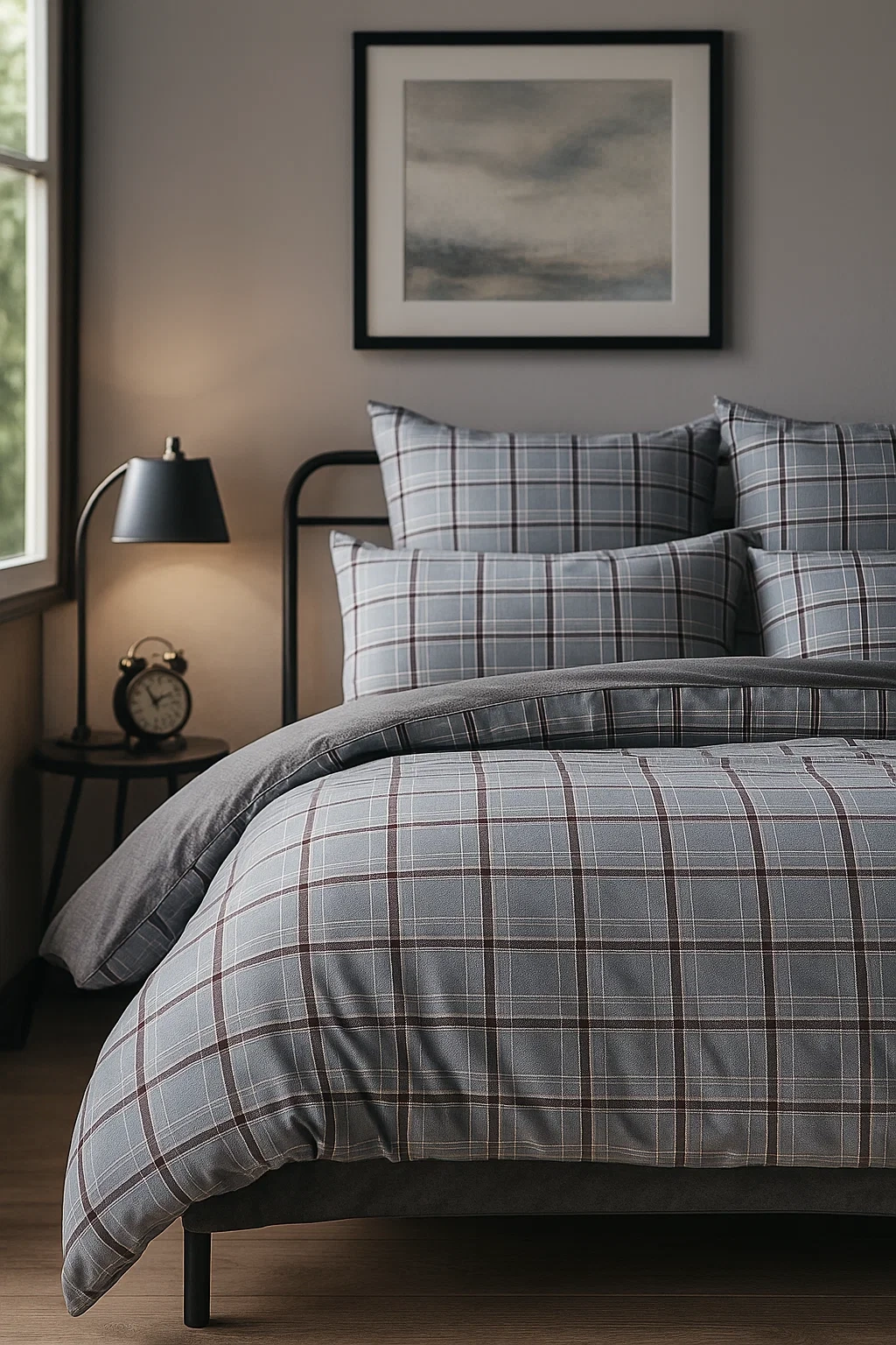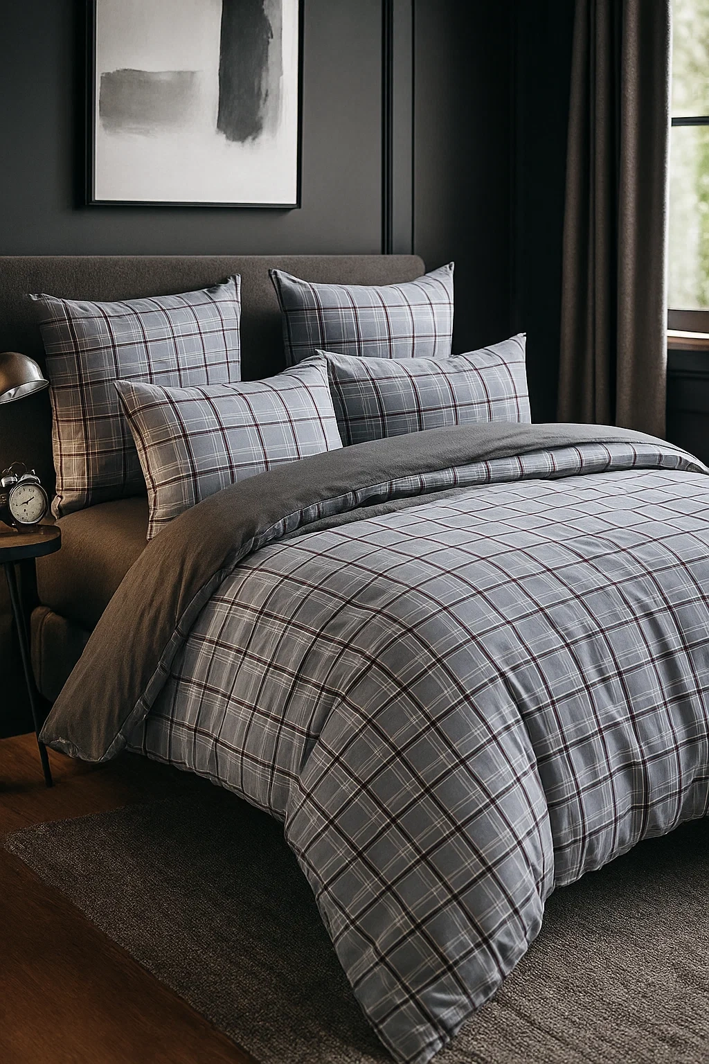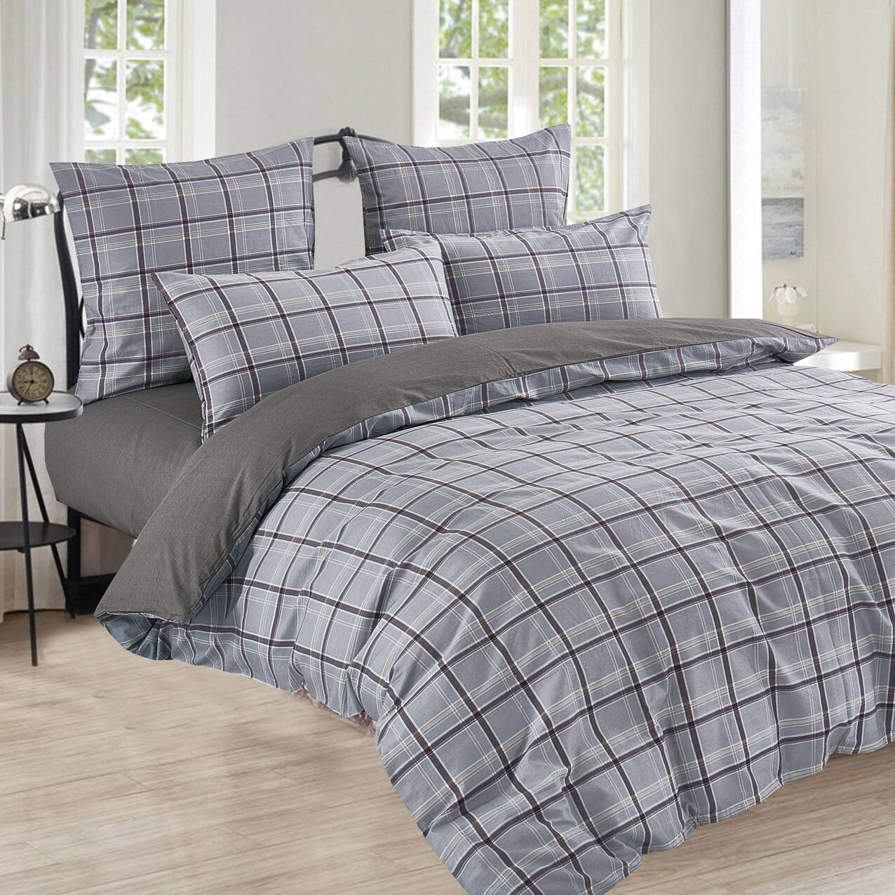 • Komplet szaro-czarnej pościeli z naturalnej bawełny w kratę. To wzory idealnie współgrające z bawełnianym materiałem . Oddychająca i naturalna pościel w zestawie z poszewkami na poduszki 70x80 i prześcieradłem 180x230.