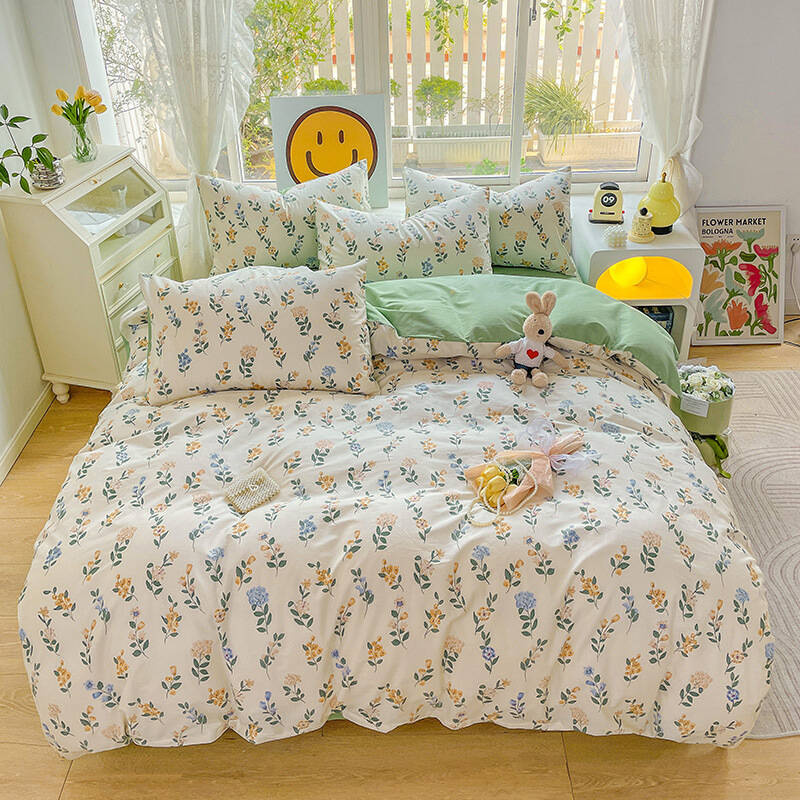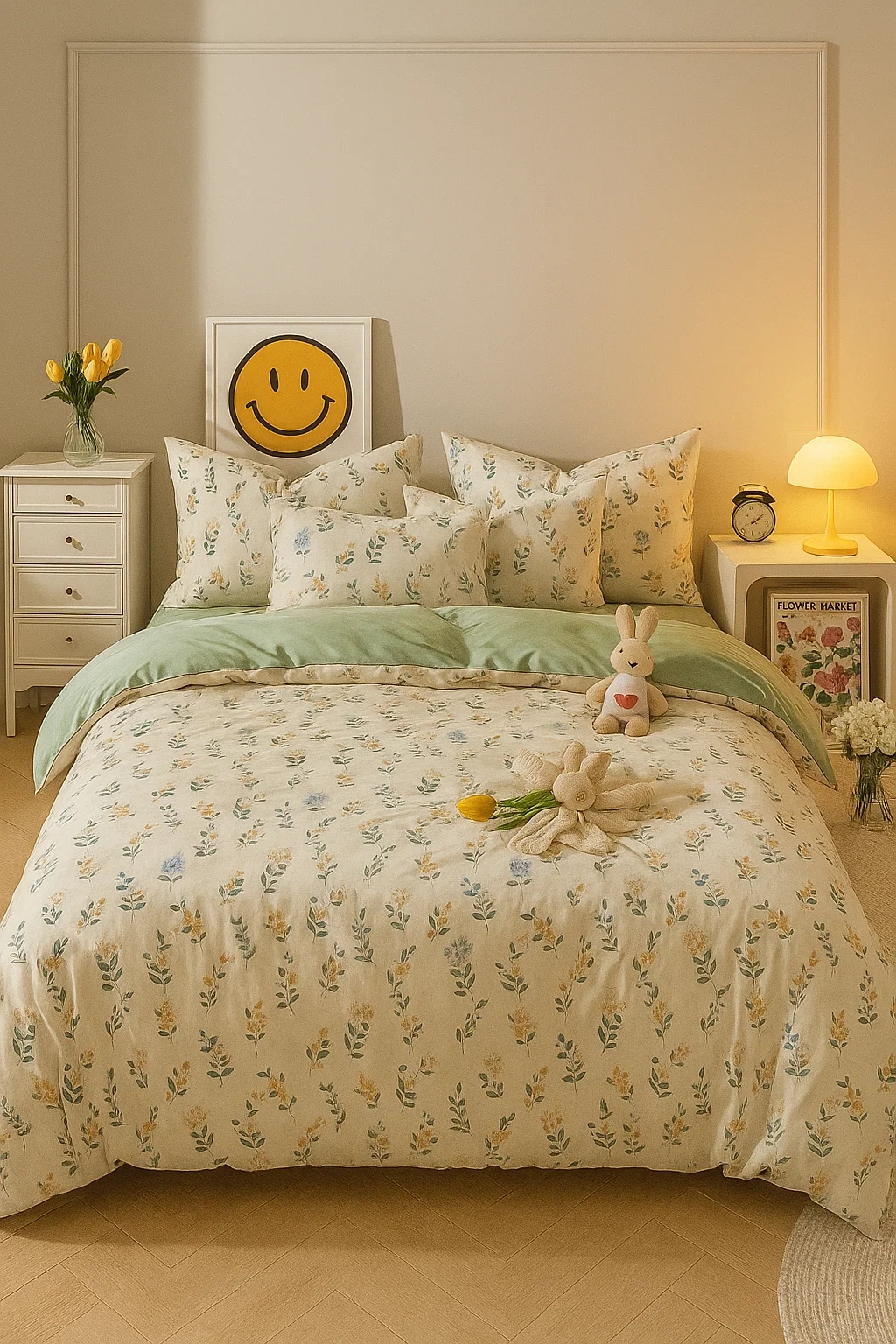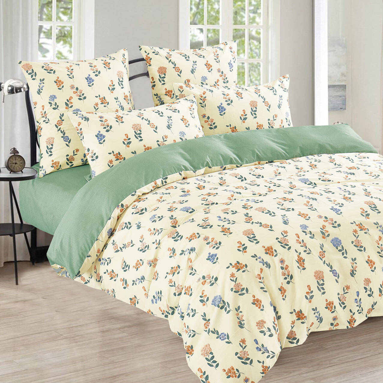 - Komplet biało-zielonej pościeli z naturalnej bawełny w drobne wzorki. Kwiatki i liście to wzory idealnie współgrające z bawełnianym materiałem . Oddychająca i naturalna pościel w zestawie z poszewkami na poduszki 70x80.