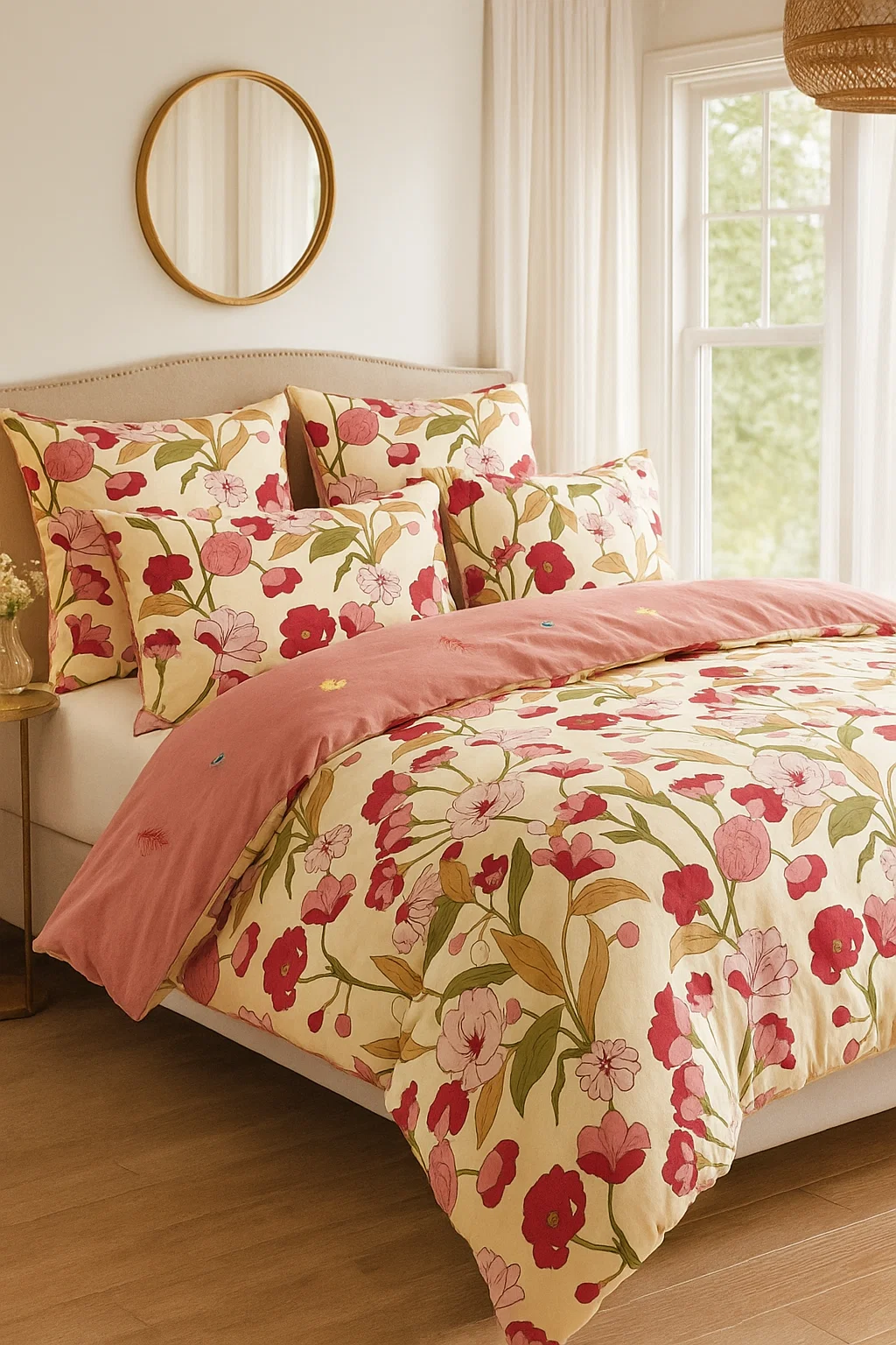 - Komplet różowo-kremowej pościeli z naturalnej bawełny w kwiatki to stylowy dodatek do każdej sypialni. Oddychająca i naturalna pościel w zestawie z poszewkami na poduszki 70x80.