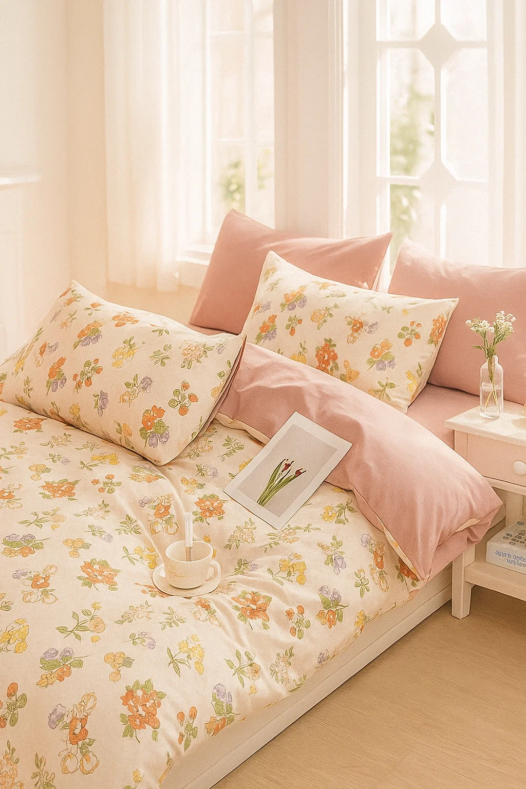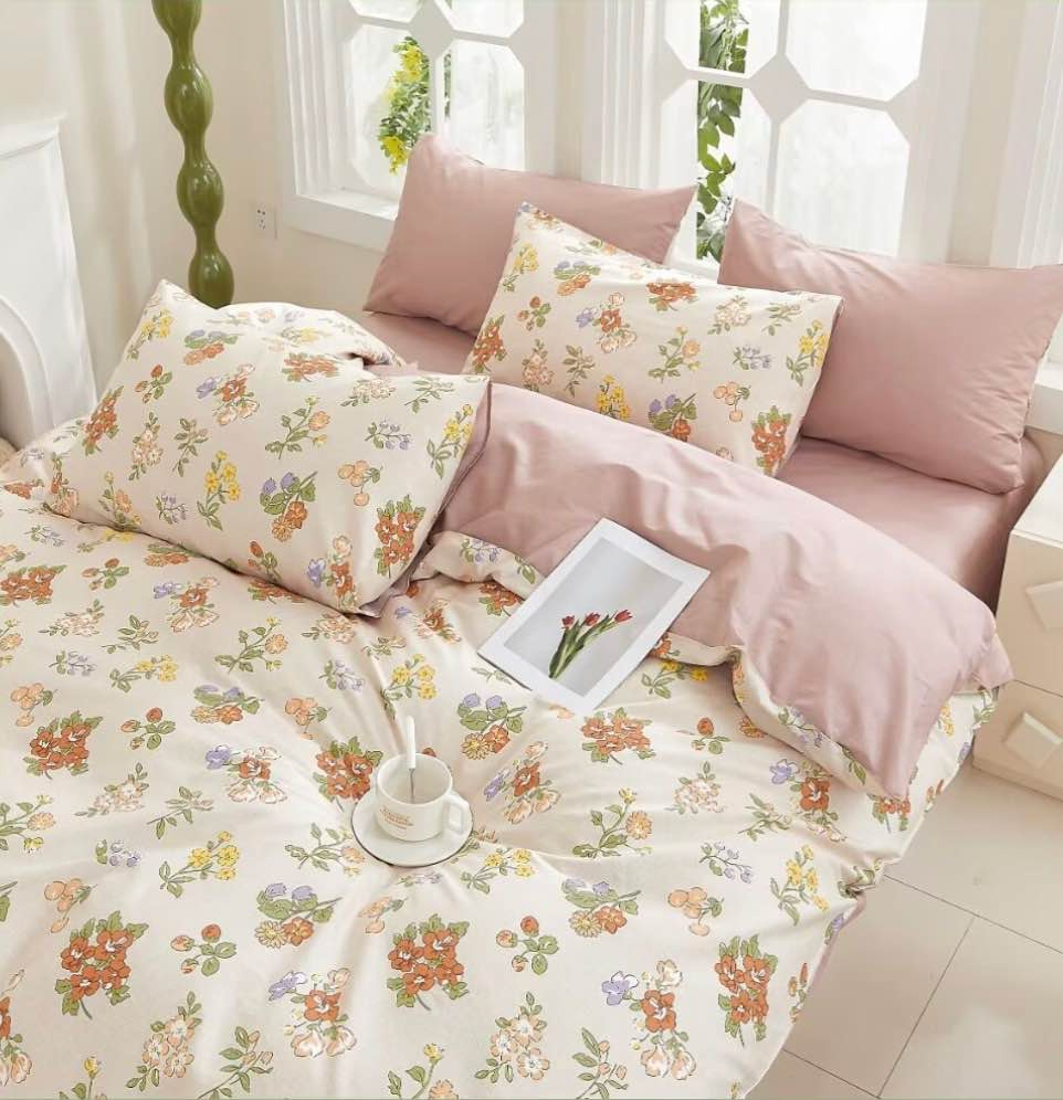 - Komplet kremowo-różowej pościeli z naturalnej bawełny w drobne wzorki. Kwiatki i liście to wzory idealnie współgrające z bawełnianym materiałem . Oddychająca i naturalna pościel w zestawie z poszewkami na poduszki 70x80 i prześcieradłem 180x230.
