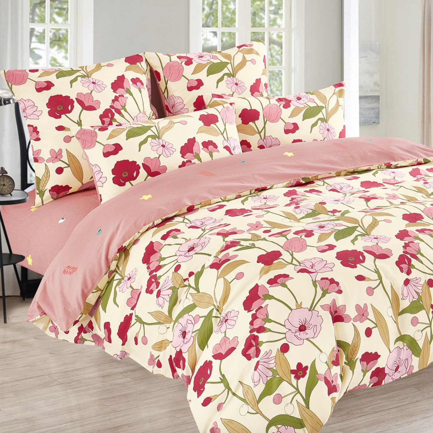 - Komplet kremowo-różowej pościeli z naturalnej bawełny w drobne wzorki. Kwiatki i liście to wzory idealnie współgrające z bawełnianym materiałem . Oddychająca i naturalna pościel w zestawie z poszewkami na poduszki 70x80 i prześcieradłem 180x230.