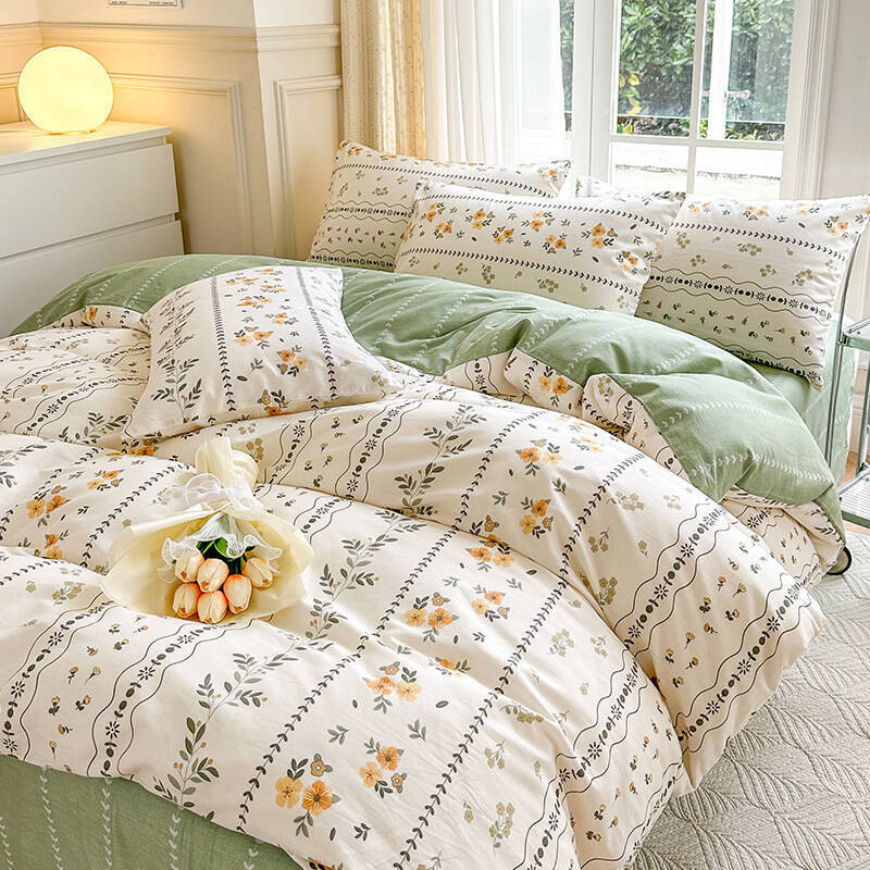 - Komplet jasnej zielonej pościeli z naturalnej bawełny we wzór kwiatów i liści to stylowy dodatek do każdej sypialni. Oddychająca i naturalna pościel w zestawie z poszewkami na poduszki 70x80 i prześcieradłem 200x230.