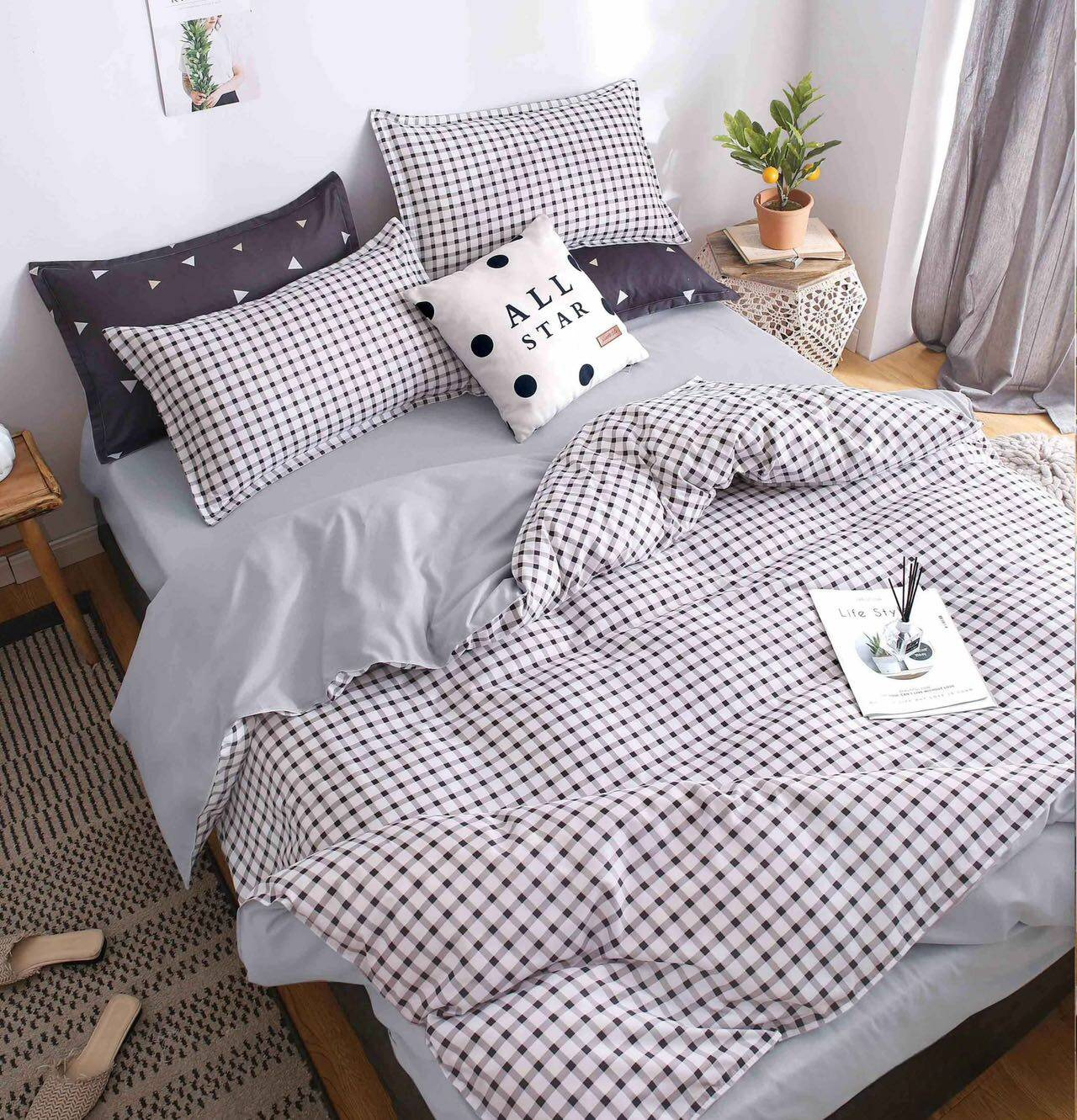 - Komplet biało-szarej pościeli 160x200 skład: 100% mikrowłókno dwustronna poszewka na kołdrę i 2 x poszewka na poduszkę 70x80, prześcieradło 180x230, pościel w kratę, biała, jasna szara